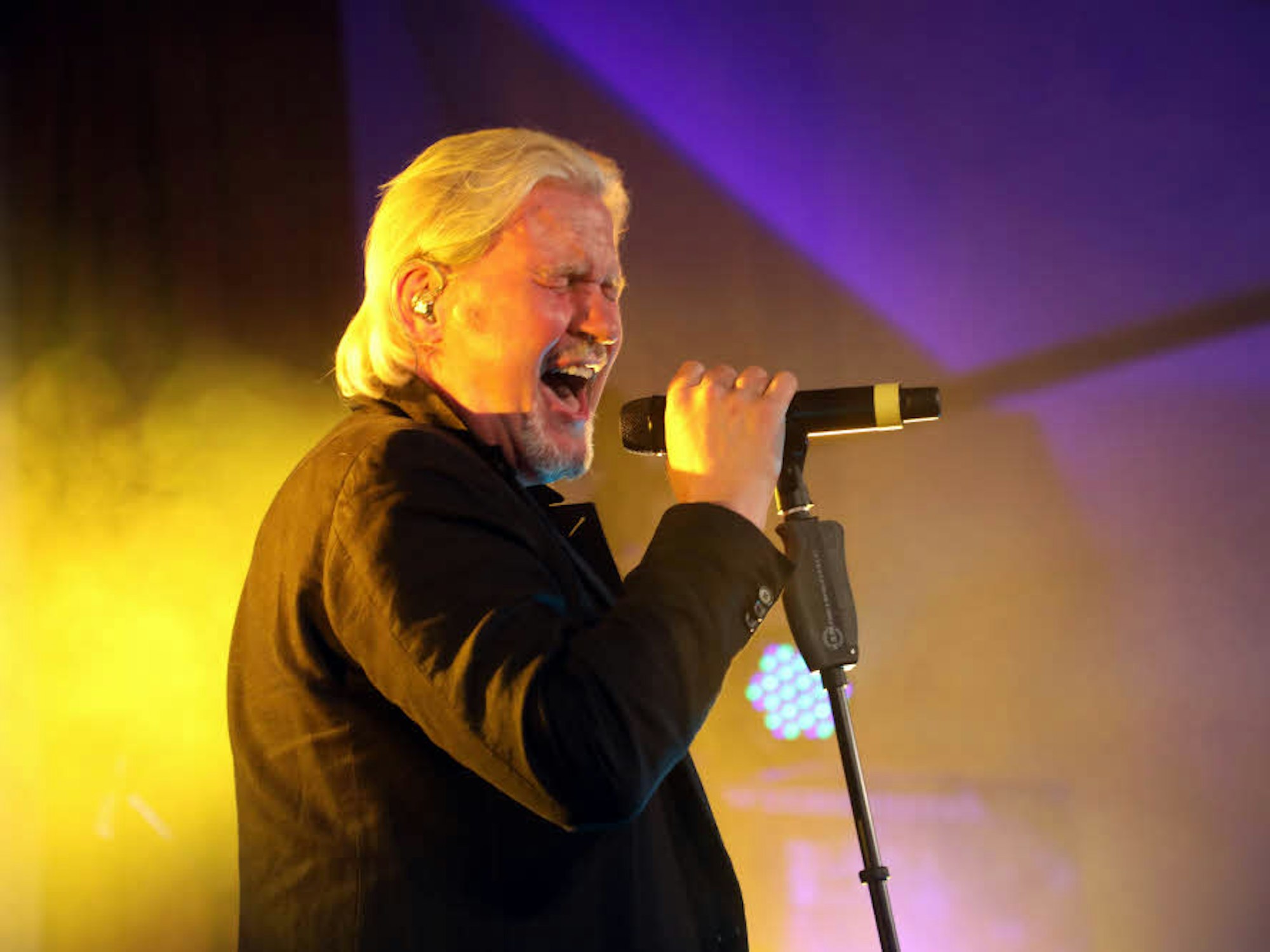 Erlebnis in Klang und Farben: Johnny Logan (o.l.) und Yvonne Rüller (u.r., im Duett mit Thomas Mersch) rissen beim „Unger-Uns“-Konzert ebenso mit wie Drummer Wolf Simon (u.l., mit Sohn Ben am Bass), Gitarrist Klaus Spangenberg, Keyboarder Matthias Ulmer und Bassist Werner Kopal.
