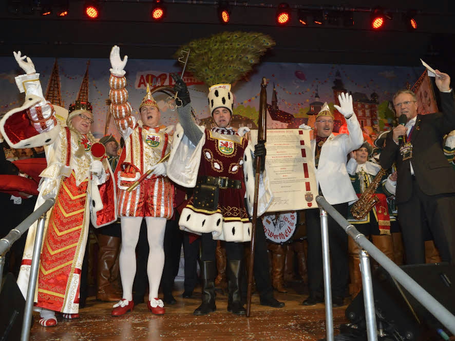 Rösraths Dreigestirn, Prinz Andreas I., Bauer Christian und Jungfrau Saskia, wurde am Samstag von Bürgermeister Marcus Mombauer (r.) proklamiert.