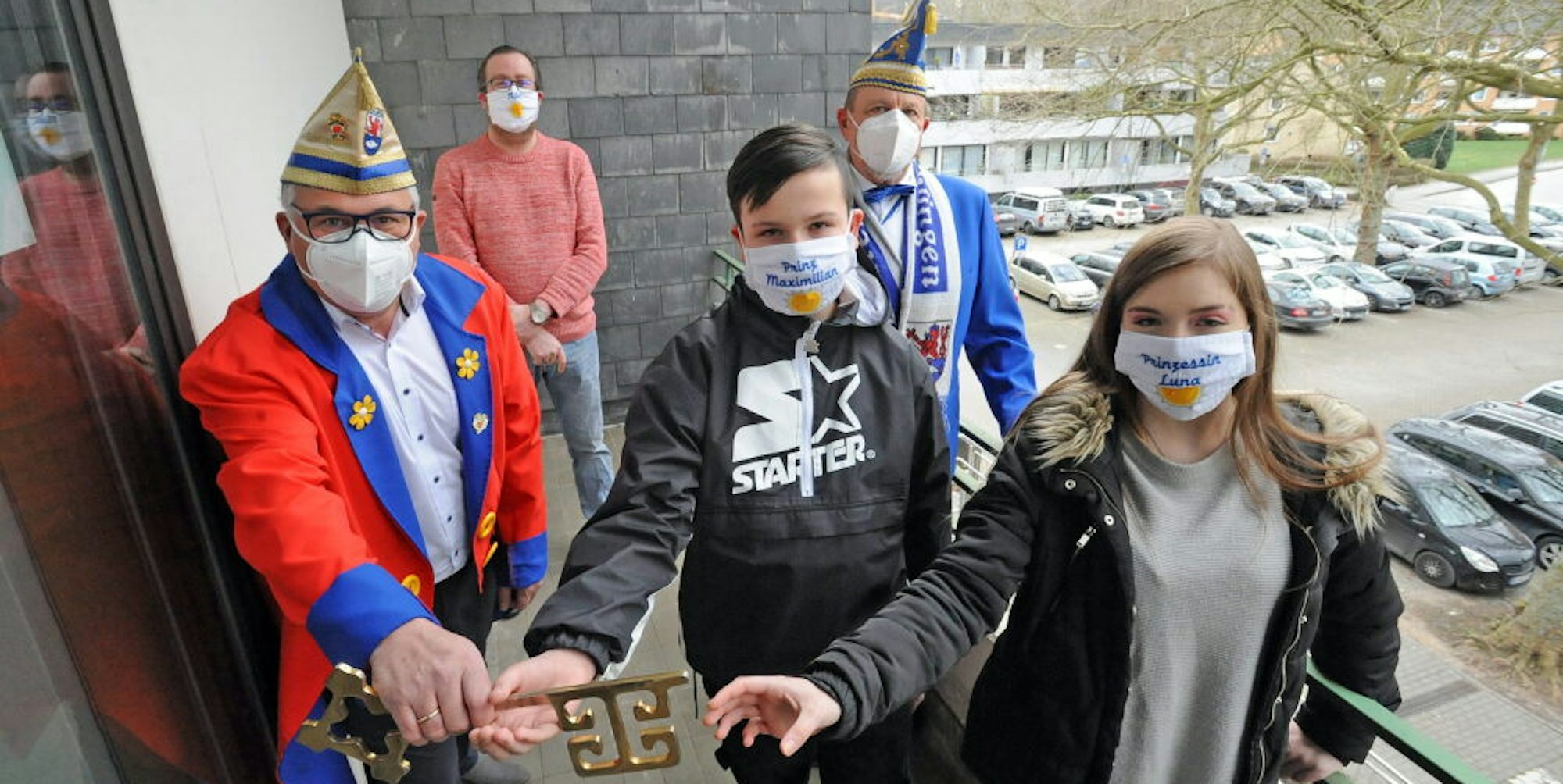 Vorgestellt wurden Prinzessin Luna I. und Prinz Maximilian I., die gemeinsam das Jugendprinzenpaar für die nächste Session bilden werden. Der 13-Jährige und die 14-Jährige tragen über den medizinischen Masken auch hübsche, mit Namen und Sonnen bestickte Masken. „Heute ist der richtige Tag dafür“, verkündet der Präsident der Vereinigung Leichlinger Karneval (VLK), Werner Fuchs. „In diesen Zeiten ist ja alles anders.“