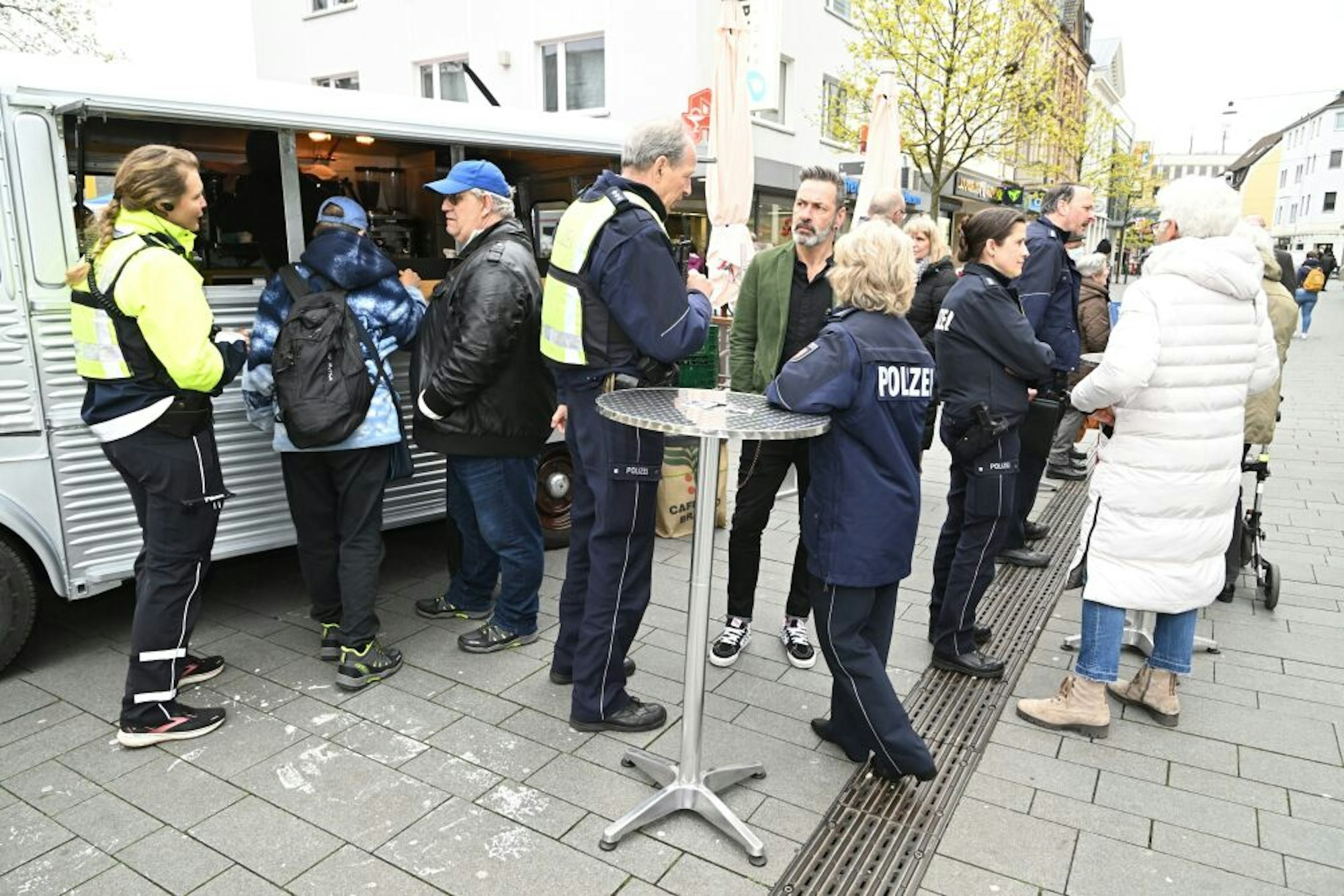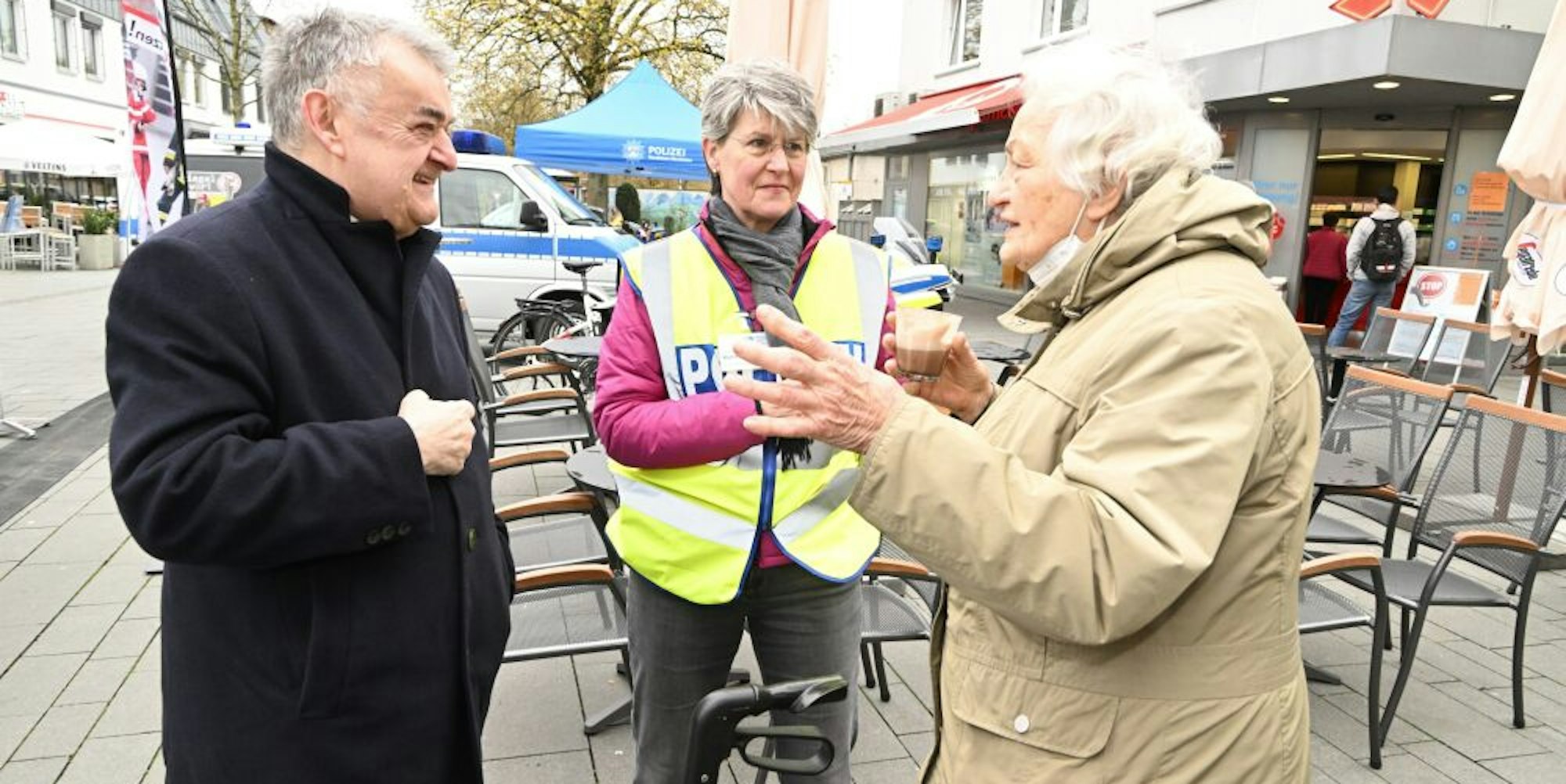 Bergisch Gladbach – Kurz stutzt Helga Henk, als ihr auf dem Weg durch die Fußgängerzone niemand anderes als NRW-Innenminister Herbert Reul umringt von Polizisten einen Kaffee anbietet. Dann lässt sich die Bergisch Gladbacherin, die mit ihrem Rollator auf dem Weg zum Wochenmarkt ist, auf einen Kakao ein. Den gibt’s auch am Café-Mobil, mit dem die Polizei am Mittwochmorgen Station in Gladbachs Fußgängerzone machte.