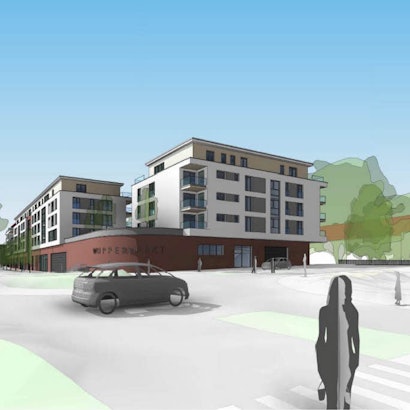 Die neueste Ansicht des Neubaus an der Wupper mit Rathausplatz (links) und Supermarkt im Erdgeschoss.