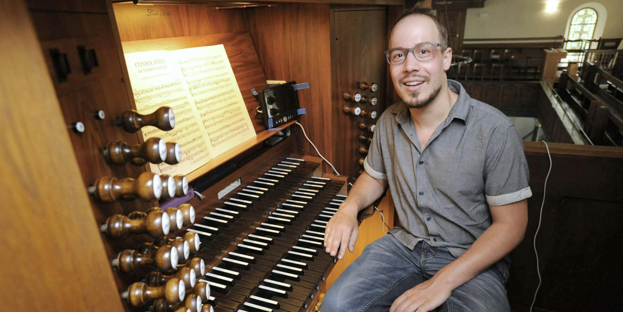 Kantor Carsten Ehret an der 40 Jahre alten Orgel in der evangelischen Kirche an der Marktstraße.
