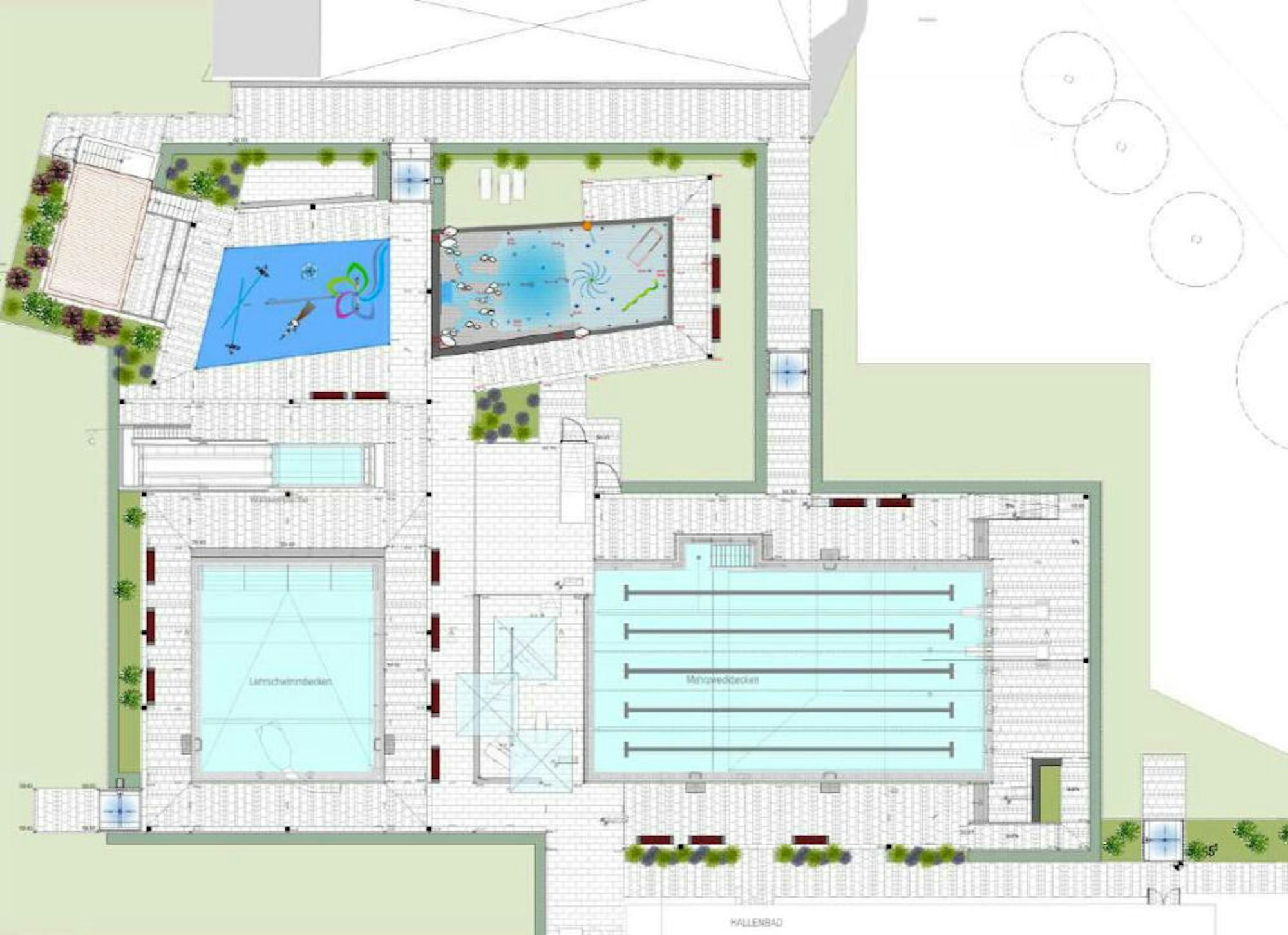Der Entwurf für das Freibad zeigt unten rechts das Sportbecken, links daneben den Nichtschwimmer-Pool, oben den Kinderbereich mit Spraypark und dazwischen eine Rutsche.