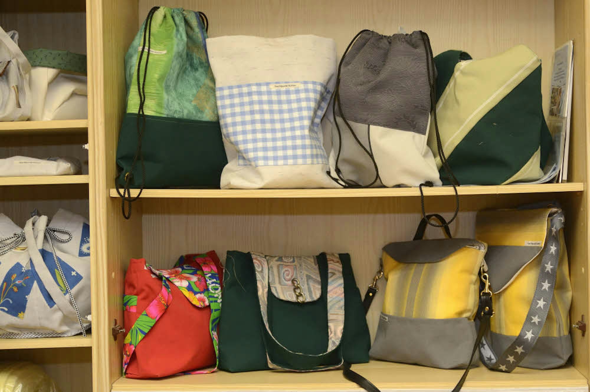 Die Taschen sind aber der absolute Renner der Nähstube. Die festen Stoffe sind meist bunt und sorgen für ein Erscheinungsbild, das auffällt. Oft sind es Stoffreste, die kaum anders zu verwenden sind. Dem Endprodukt schadet das nicht. Statt in irgendwelchen Schränken landen die Sache auf dem Nähtisch. Auch Restmeter von Markisenstoffen sind darunter, zur Verfügung gestellt von einem in Bergisch Gladbach ansässigen Unternehmen.