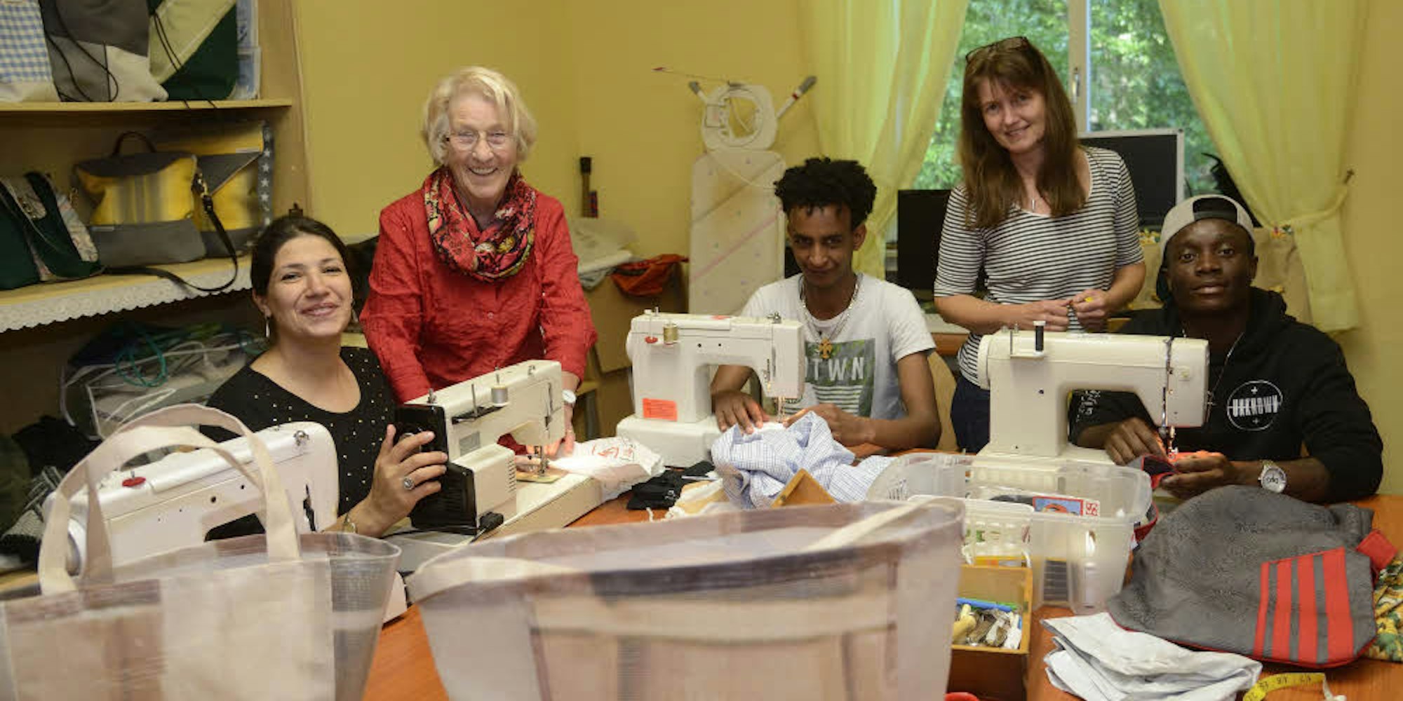 Kürten – Die Taschen aus dieser Nähstube sind ein Gemeinschaftswerk. Im Wohnhaus in Kürten-Schanze leben Geflüchtete, meist junge Männer. Einmal in der Woche rattern in einem Räumchen im Obergeschoss des großen Hauses die Nähmaschinen. Dann hat die Nähstube wieder geöffnet.