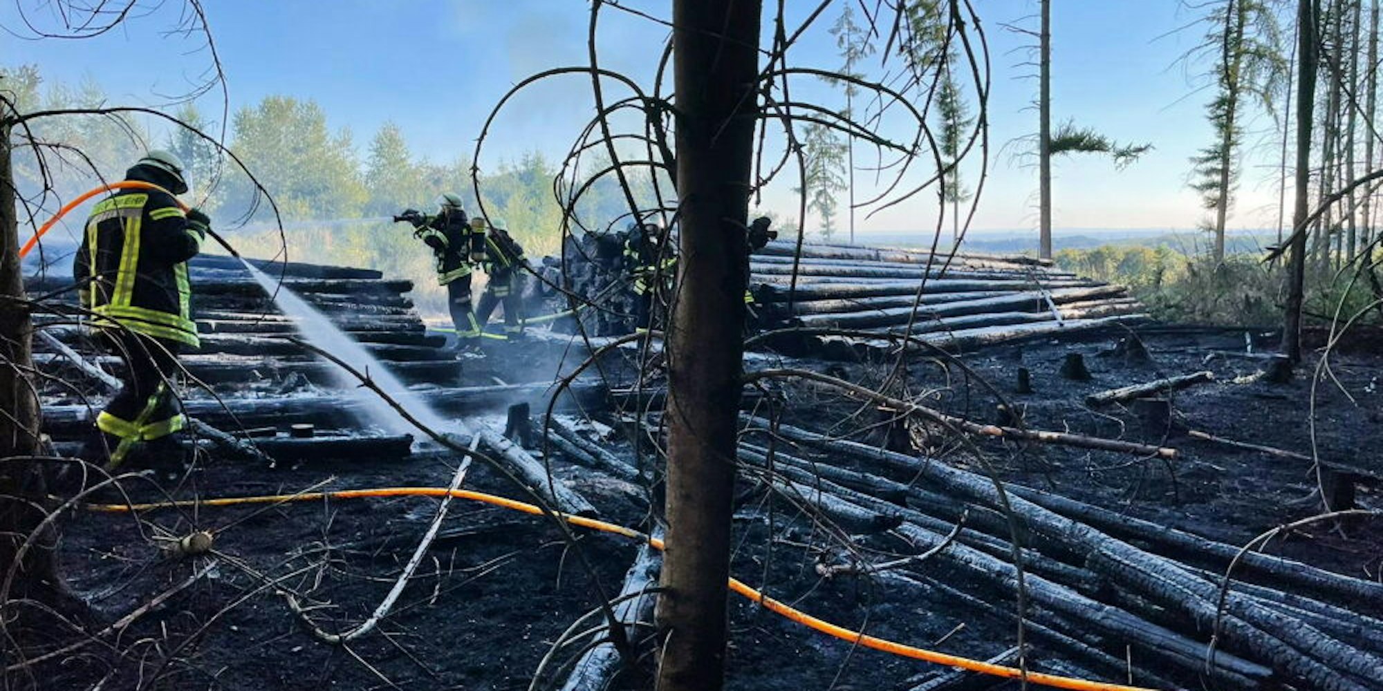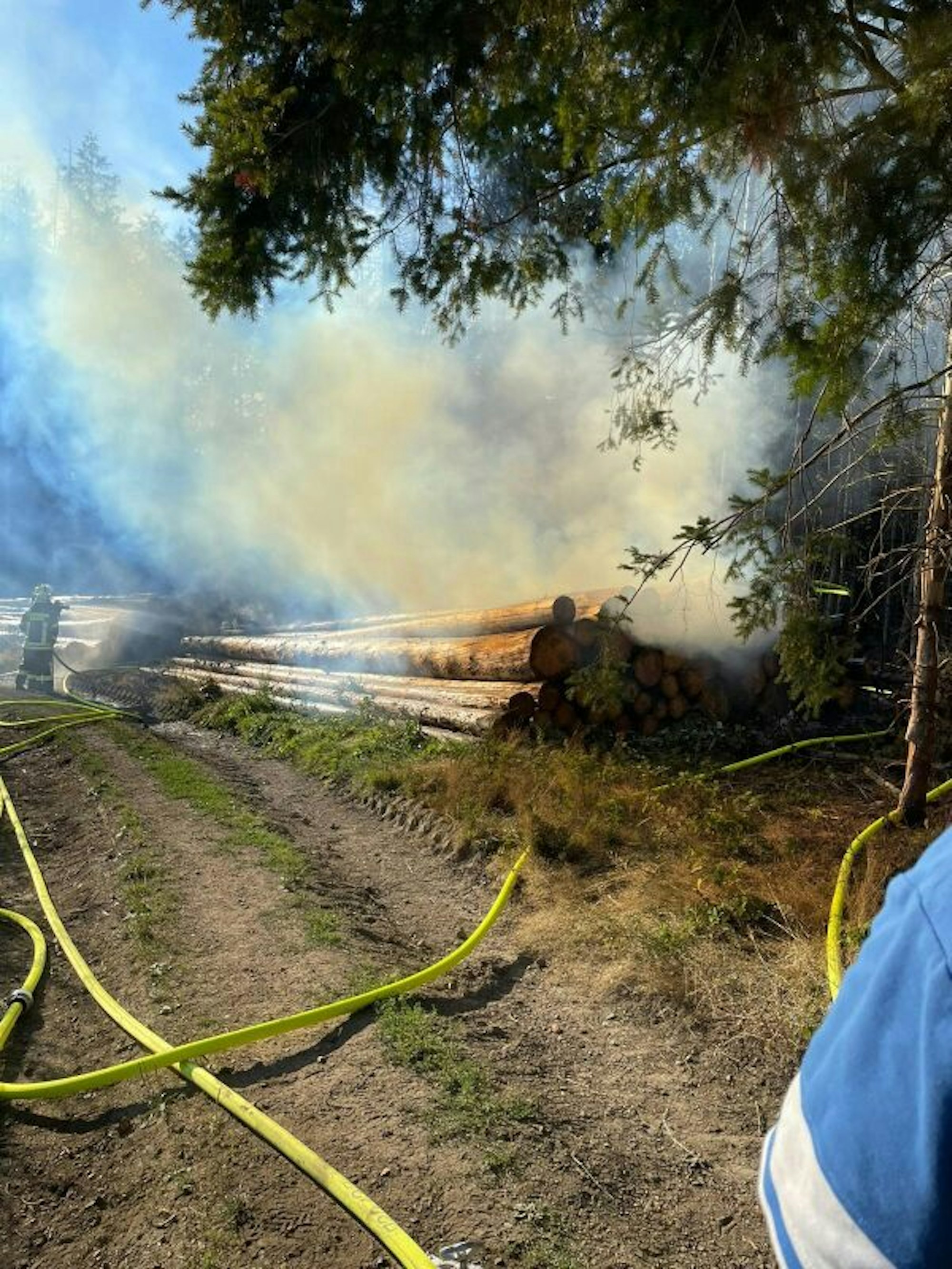 Nur wenige Bäume des angrenzenden Waldes haben die Flammen der brennenden Holzstapel erreicht, bevor die Feuerwehr die Brandausbreitung stoppen konnte.