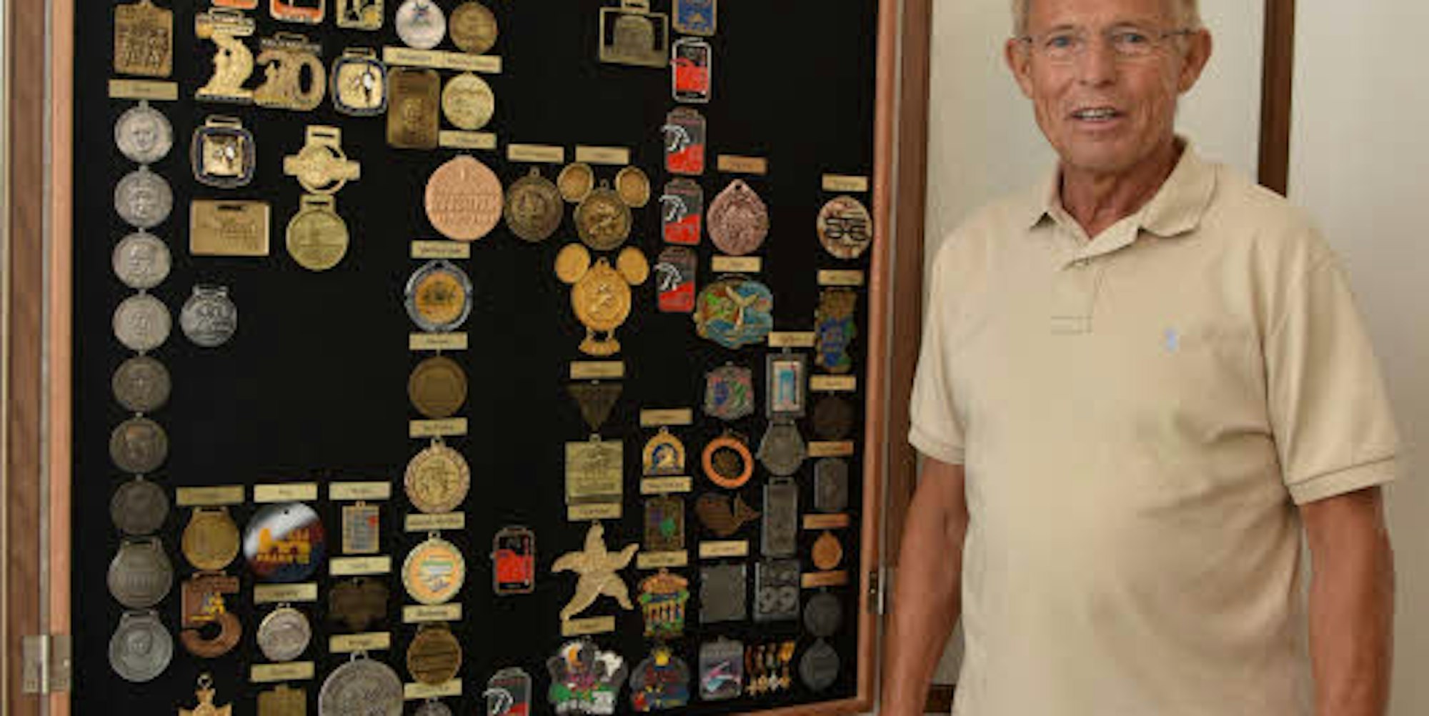 Klaus Dieter Krasel vor der Galerie seiner internationalen Laufmedaillen.