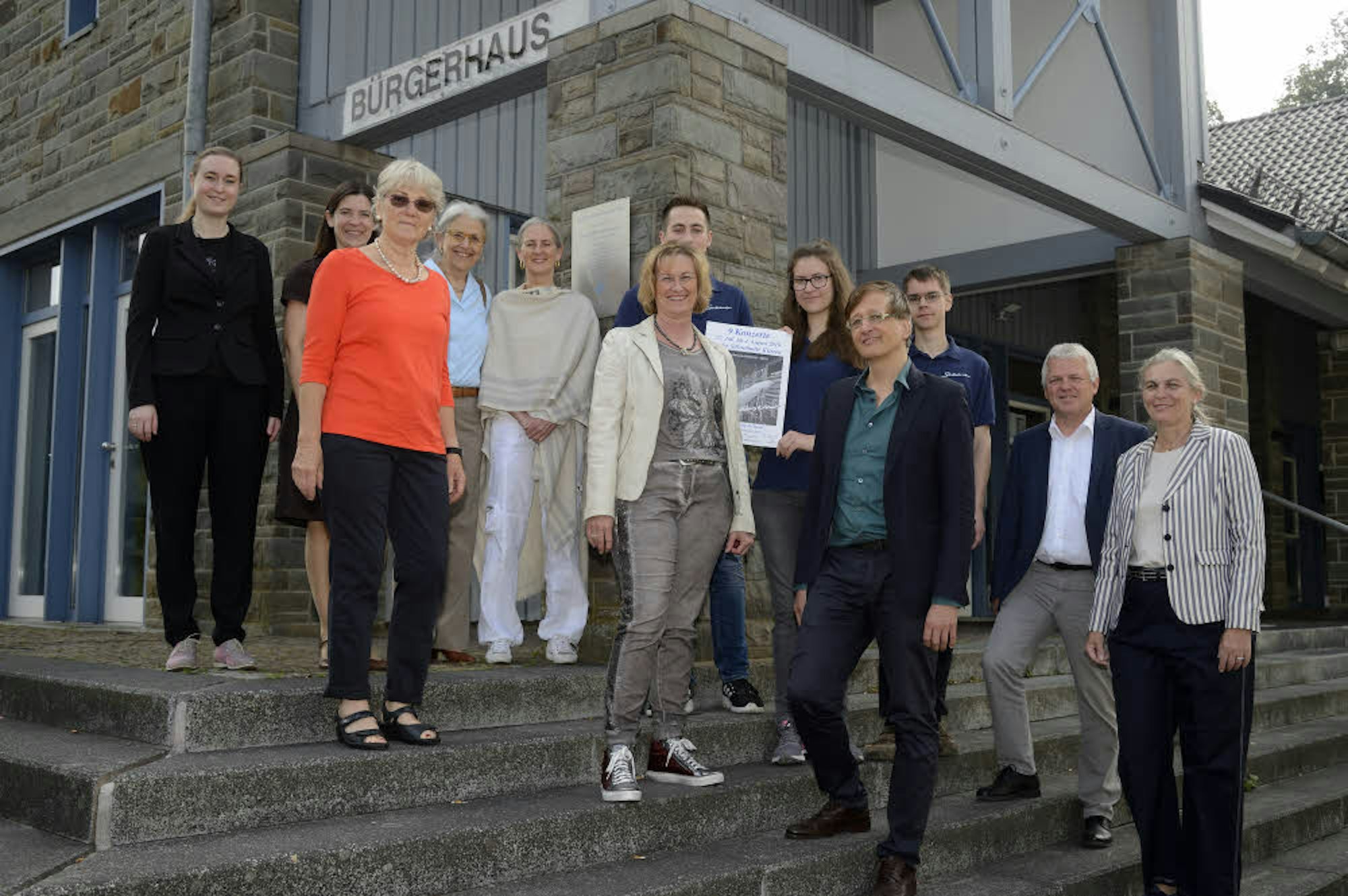Die Organisatoren und Unterstützer der Stockhausen-Konzerte und -Kurse gemeinsam auf der Treppe am Bürgerhaus Kürten.