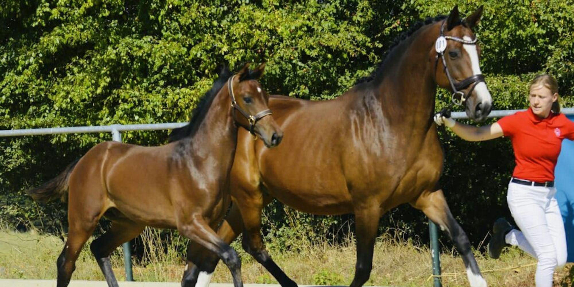 Fohlen „Zamiro“ mit Mutter „Isabelle“ im Führkreis. „Zamiro“ erhielt am Samstag eine Goldmedaille.