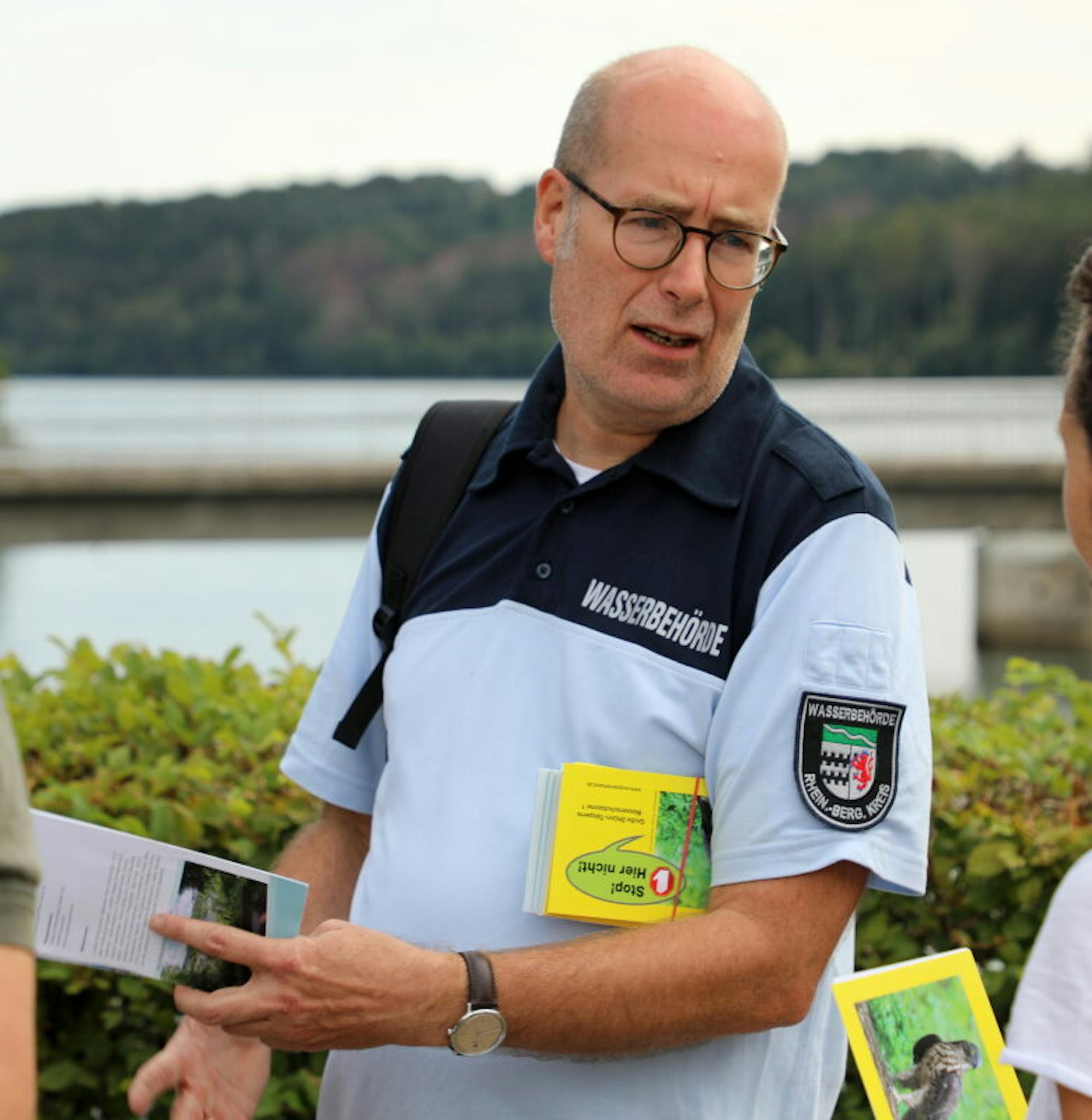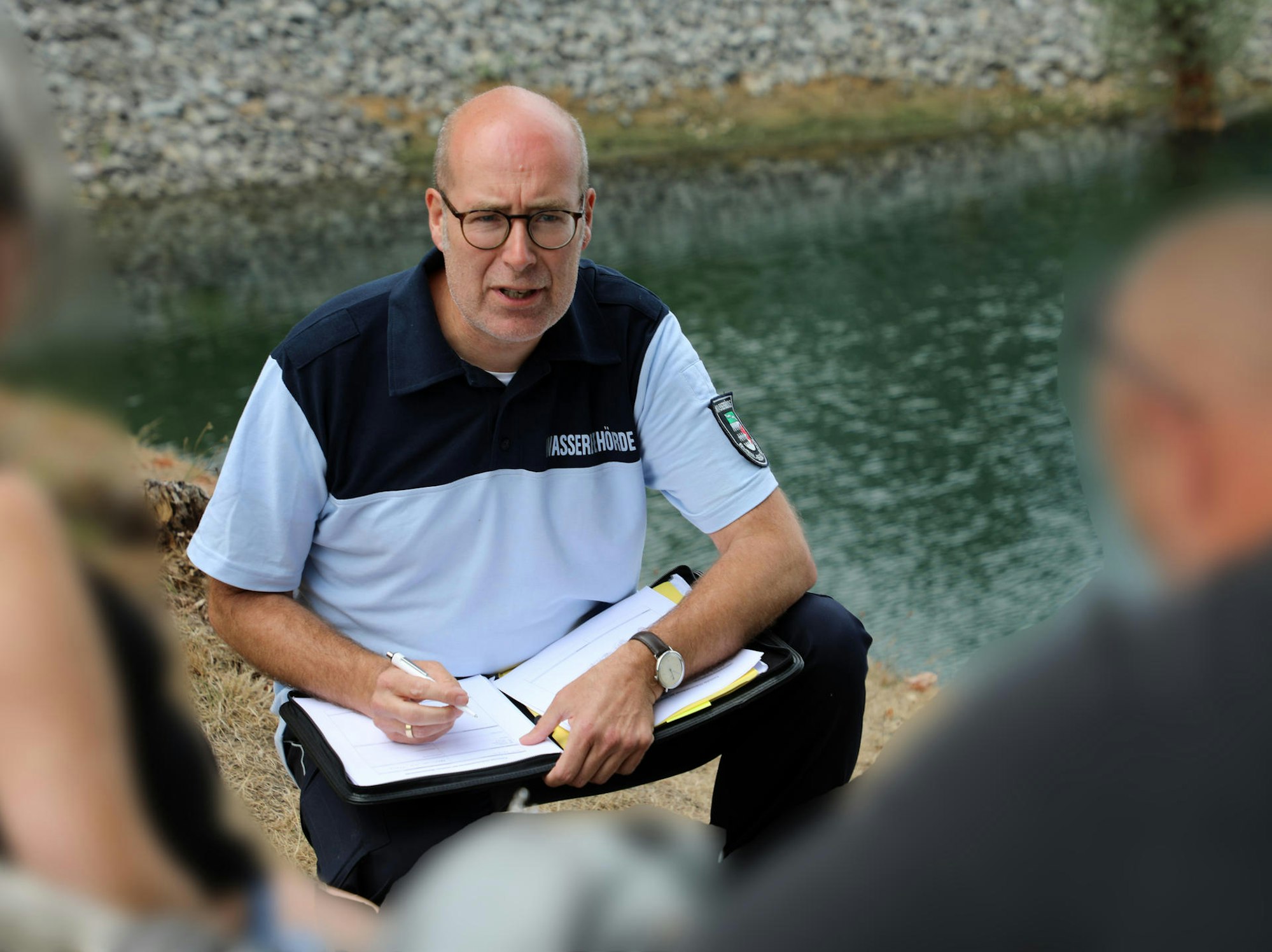 Helmerichs weist nochmals auf den Schutz des Wassers hin, aus dem Trinkwasser für eine Million Menschen im Bergischen Land gewonnen wird. Einer der Hunde ist bis zum Nacken tropfnass. Helmerichs setzt trotzdem nochmals auf Einsicht, gibt den Hundehaltern ein von Biologischer Station und Wupperverband erstelltes Infoblatt. Schließlich sollen die „Hunde-Ableiner“ verstehen, warum sie jetzt ein Bußgeldbescheid erwartet – und ihr Verhalten ändern.