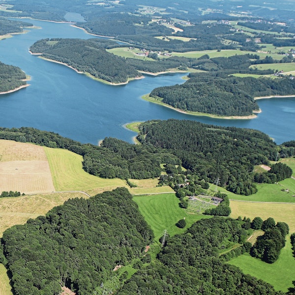 Große Stapel von gefällten Baumstämmen säumen den Weg einige hundert Meter weiter. Die Landschaft rund um die Talsperre hat sich verändert. Auch hier haben Borkenkäfer und Hitze ihre Spuren hinterlassen. „Unser Forstbetrieb ist immer noch mit dem Fällen abgestorbener Fichtenbestände beschäftigt“, sagt Wupperverbandsmitarbeiter Bisterfeld.