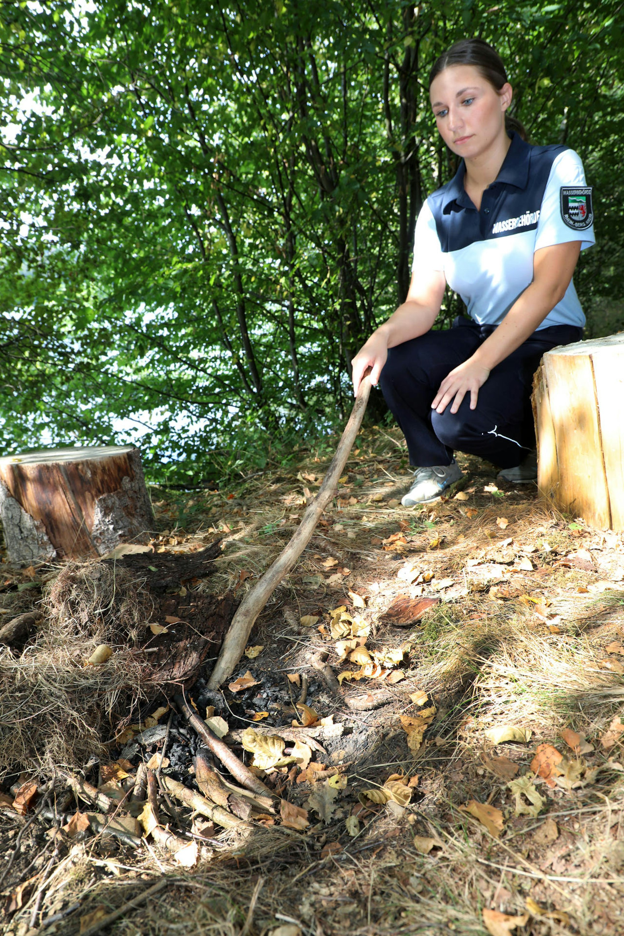 Rebecca Theis legt eine Feuerstelle mitten im trockenen Unterholz am Wasser frei.