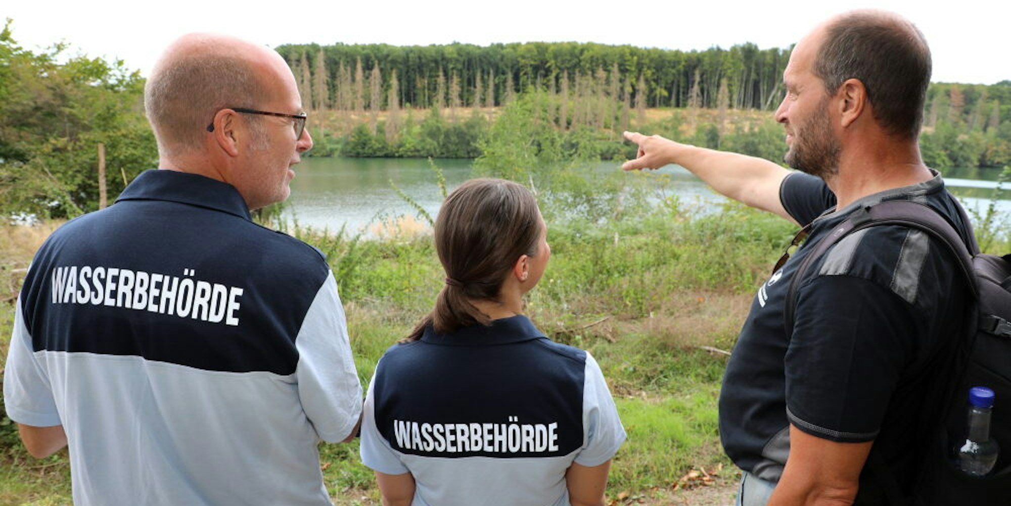 Auf Streife in der Wasserschutzzone 1: Lars Helmerichs, Rebecca Theis und Christoph Bisterfeld (v.l.) an der Vorsperre der Großen Dhünn-Talsperre .