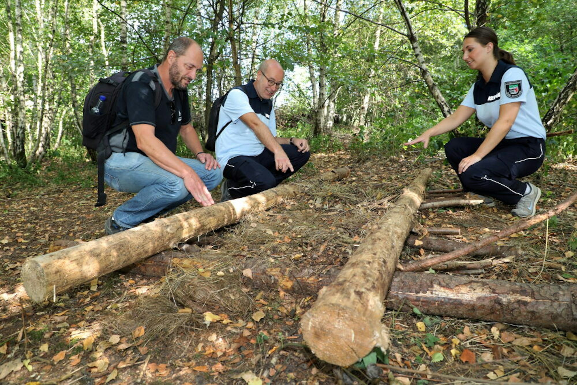 Dicht ist das Unterholz des Laubwalds ein paar Meter weiter: Das ungeübte Auge erkennt kaum den Pfad, den Helmerichs neben einem Holzstapel entdeckt hat: Keine Frage, das Grün ist hier offenbar niedergetreten worden. Aufmerksam folgt Helmerichs mit seiner Patrouille der Spur – und stößt keine drei Meter vom Ufer der Vorsperre entfernt auf säuberlich aufeinandergelegte Holzstämme. Mit Kabelbindern verbunden. Leidlich mit losem Gras „getarnt“.