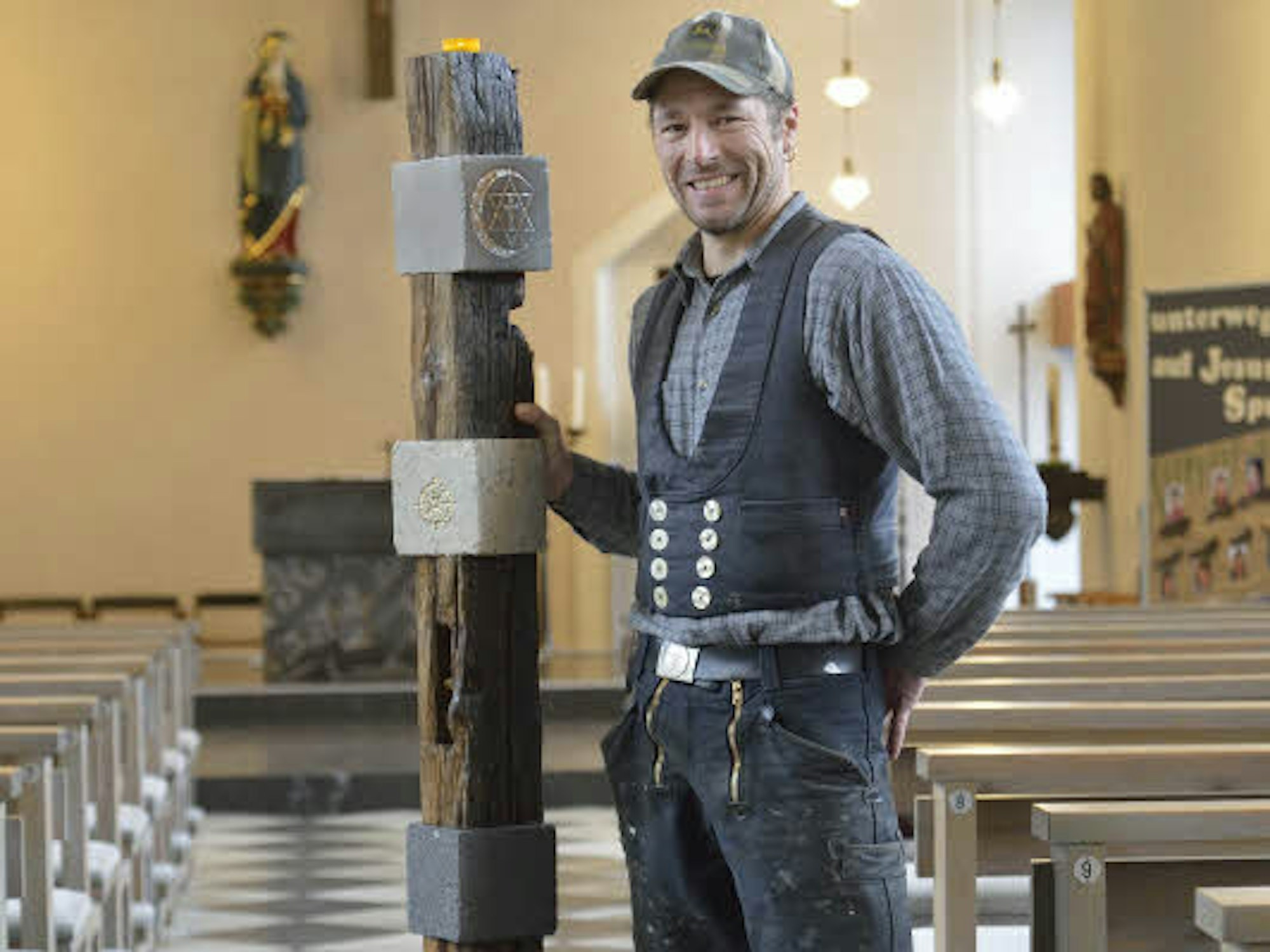 Michael Flossbach mit der Stele, die in der Kürtener Pfarrkirche steht.