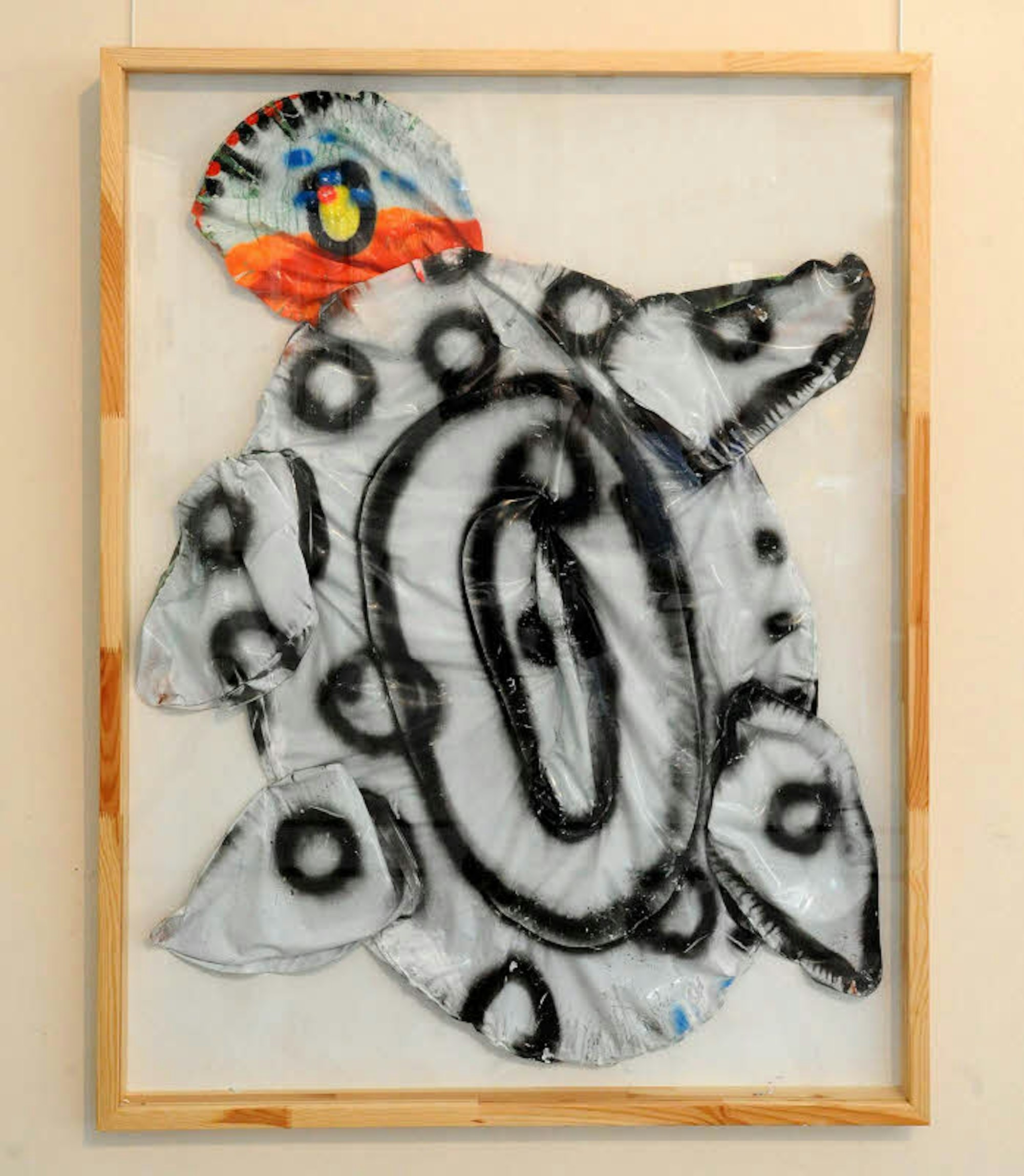 Alles sind Gemeinschaftswerke und nachdem sie zuletzt in der Ausstellung im Wassermuseum Aquarius in Mülheim an der Ruhr zu bestaunen waren, sind die Exponate nun im Badehaus zu sehen. Da allenfalls zwei Badetiere ins Auto passten, haben die Künstlerinnen sich entschieden, bei den meisten Tieren die Luft heraus zu lassen. Sie wurden arrangiert und gerahmt. Das wiederum ergab ganz neue Ansichten. Der Hals des Flamingos ist so geknickt, dass er auch als Schlange durchgehen könnte, unverkennbar ist aber der Mantarochen. Ein Krokodil fliegt im Badehaus zur Decke.