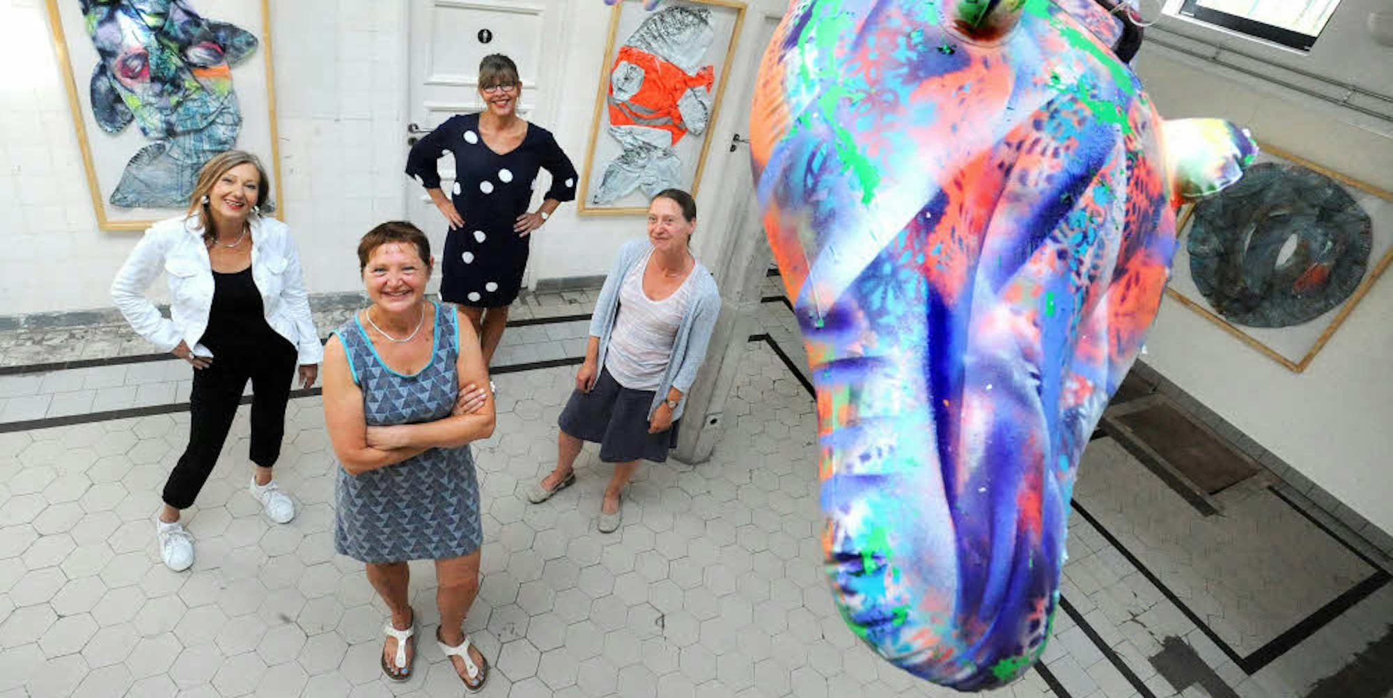 Güdny Schneider-Mombaur, Judith Funke, Susanne Müller-Kölmel und Ela Schneider stellen im Badehaus aus.