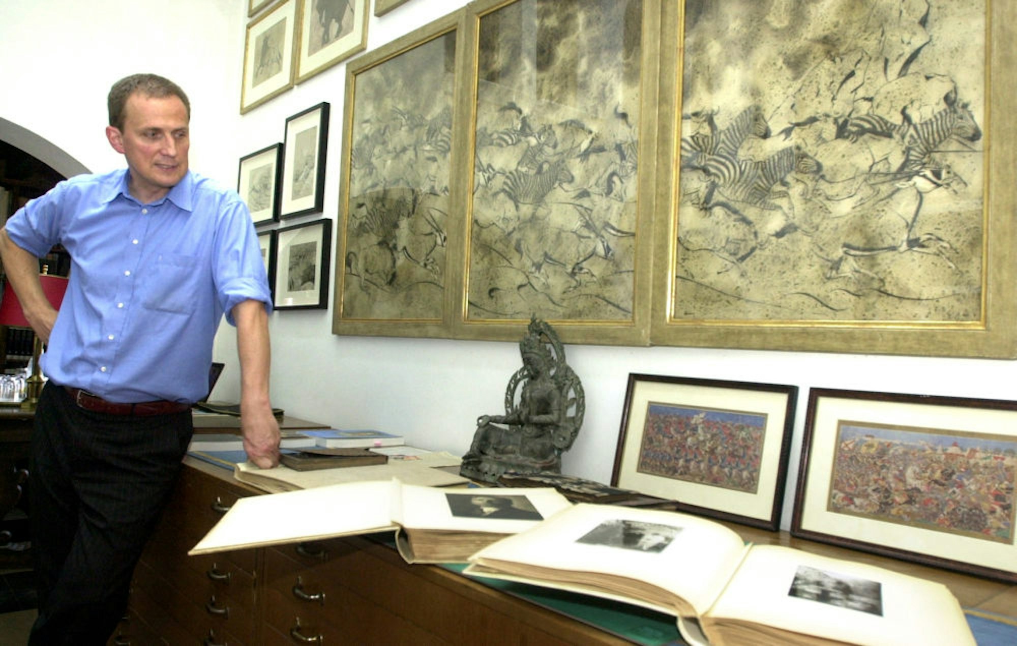 Marcus Albanus mit Gemälden aus dem Erbe Werner Peiners, an der Wand hängen weitere Tierbilder aus Afrika.