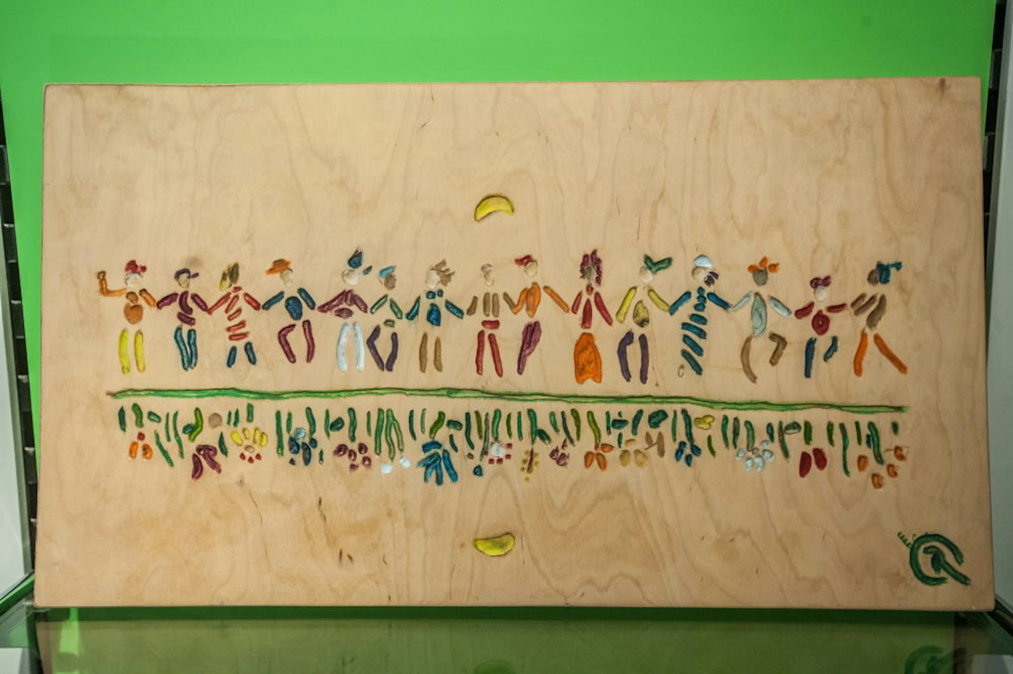■ Das spannendste Bietergefecht löste Roland Pfennigstorfs Bild „Together XXI“ aus. Es zeigt eine in Holz gefräste und mit Ölfarbe ausgemalte Menschenkette. Von angesetzten 270 schraubten mehrere Interessenten den Preis für das fröhliche Werk im Handumdrehen überraschend auf 470 Euro hoch. Quartierstreff-Besucherin Ines Schreiber, die die Versteigerung selbst mit ins Leben gerufen hat, erwarb es unter Riesenapplaus.