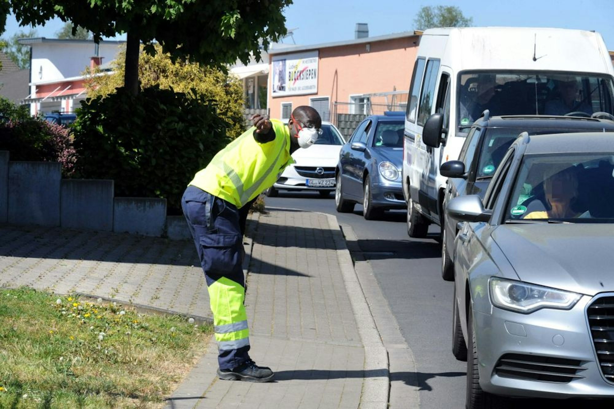 Einweiser mit Mundschutz am Leichlinger Wertstoffhof. 200 Meter weiter ist eine zweite Zufahrt geöffnet.