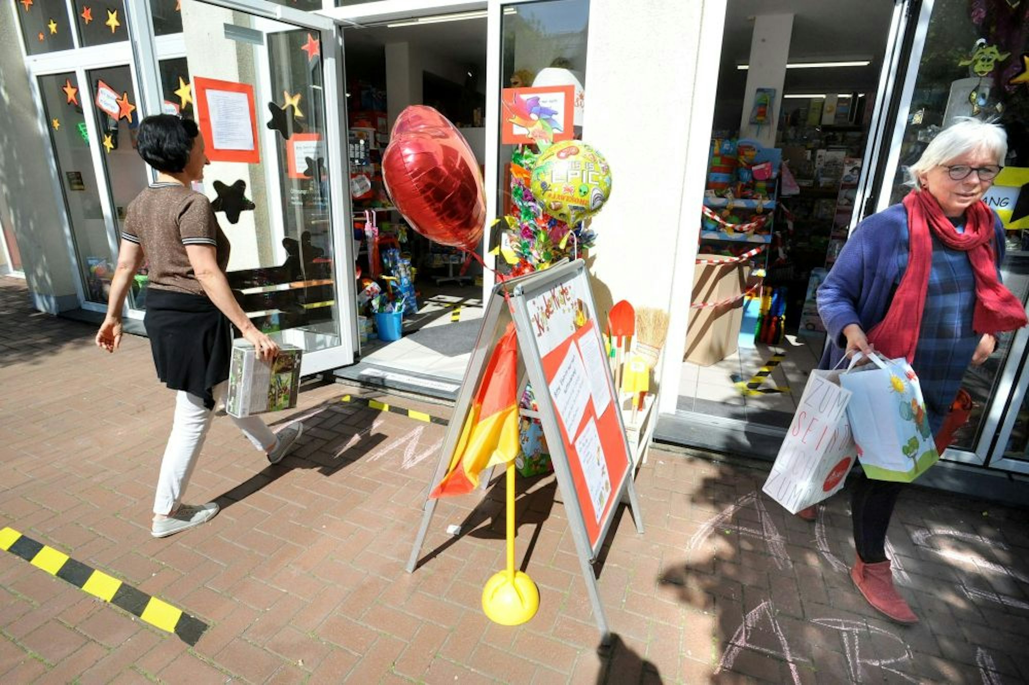 Beschränkungen der Personenzahl, Hygiene- und Abstands-Regeln sind in allen Geschäften Standard. Wer zwei Türen nutzen kann, hat getrennte Ein- und Ausgänge markiert. Im Spielwarengeschäft Kinderkiste am Leichlinger Brunnen im Brückerfeld haben die Inhaberinnen mit rot-weißem Flatterband wie auf einer Baustelle einen regelrechten Rundlauf ausgewiesen – eine Einbahnstraße führt an allen Regalen vorbei.