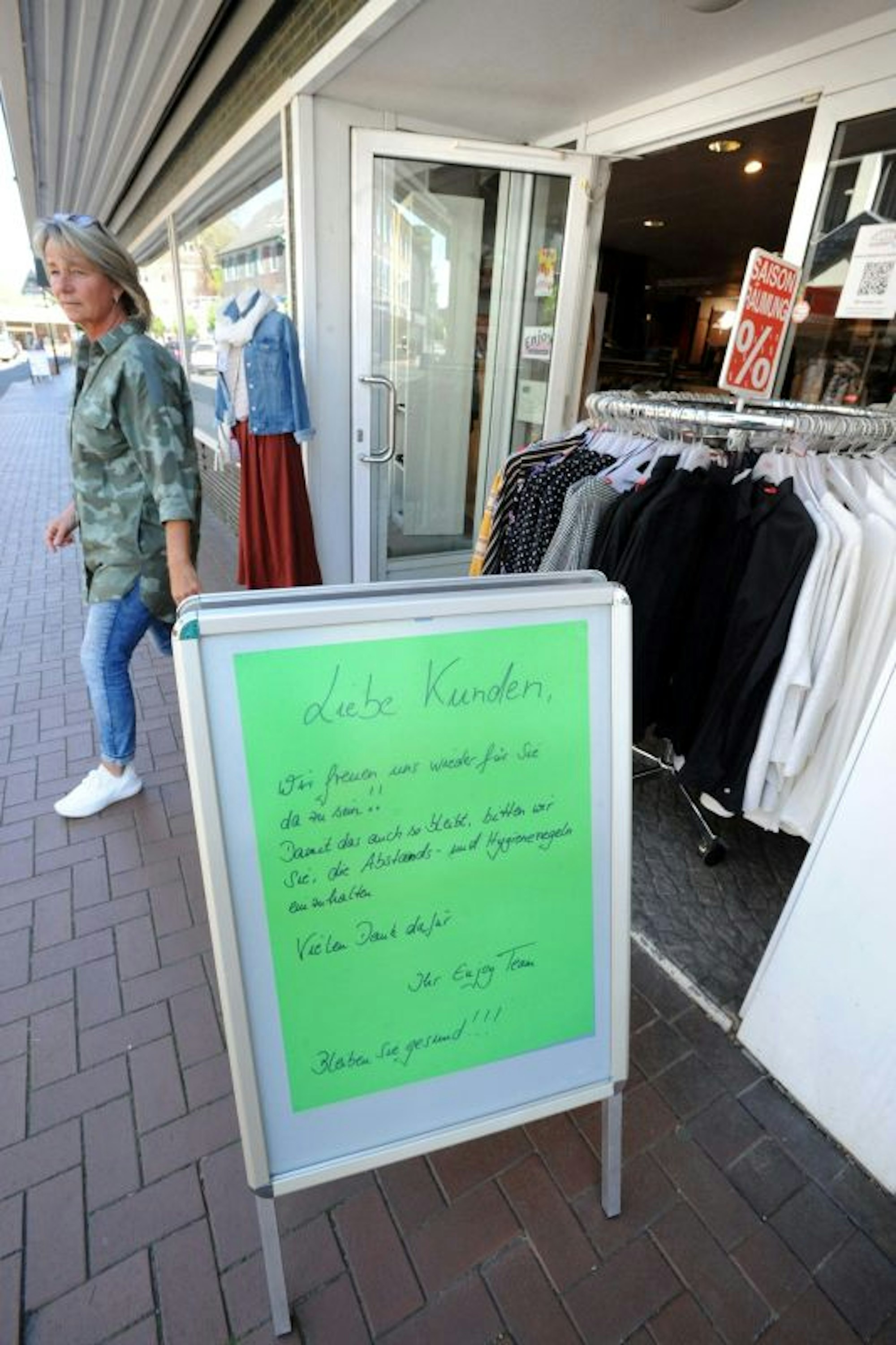 Auf der Straßenseite gegenüber feiert Männermoden Schmidt den Festtag der Wiedereröffnung mit zehn Prozent Rabatt auf alles. Die Orthopädietechniker von Mergel und Sohn haben in ihre Glastüre eine Klingel eingebaut, mit der Kunden sich nun melden können und einzeln eintreten dürfen.