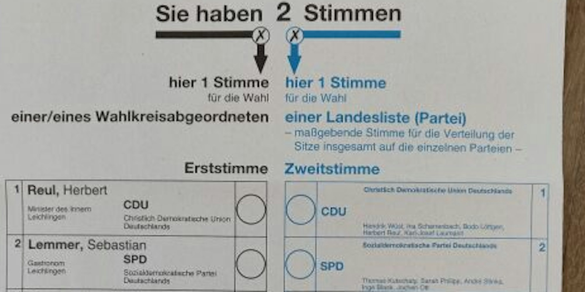 Der Wahlzettel hat zwei Hälften für die Erst- und Zweitstimmen. Links macht man sein Kreuz für einen Direktkandidaten – wer die einfache Mehrheit erringt, ist gewählt. Es bewerben sich hier sieben Personen, ausschließlich Männer, um das Mandat für die nächsten fünf Jahre: In der amtlichen Reihenfolge Herbert Reul (CDU), Sebastian Lemmer (SPD), Marco Frommenkord (FDP), Carlo Clemens (AfD), Jürgen Langenbucher (Grüne), Mike Galow (Linke) und Simon Pugnaghi (Volt). In der rechten Spalte entscheidet die Zweitstimme für die Landeslisten der Parteien und Vereine über den künftigen Proporz der Politik im Landtag – und damit auch über mögliche Regierungsbildungen.
