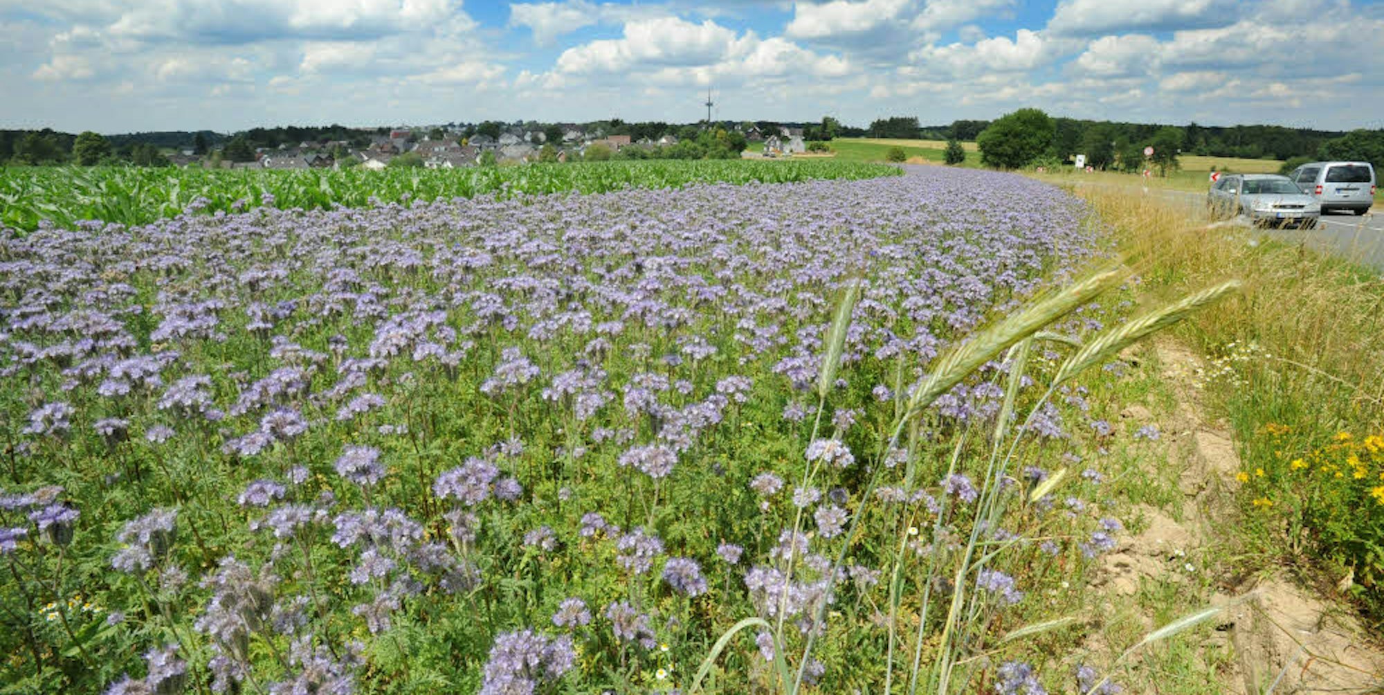 Bienenweide bei Witzhelden-Kuhle: Der Ackerrandstreifen neben der L 294 mit blühenden Phacelia wird auch noch Sonnenblumen hervorbringen.