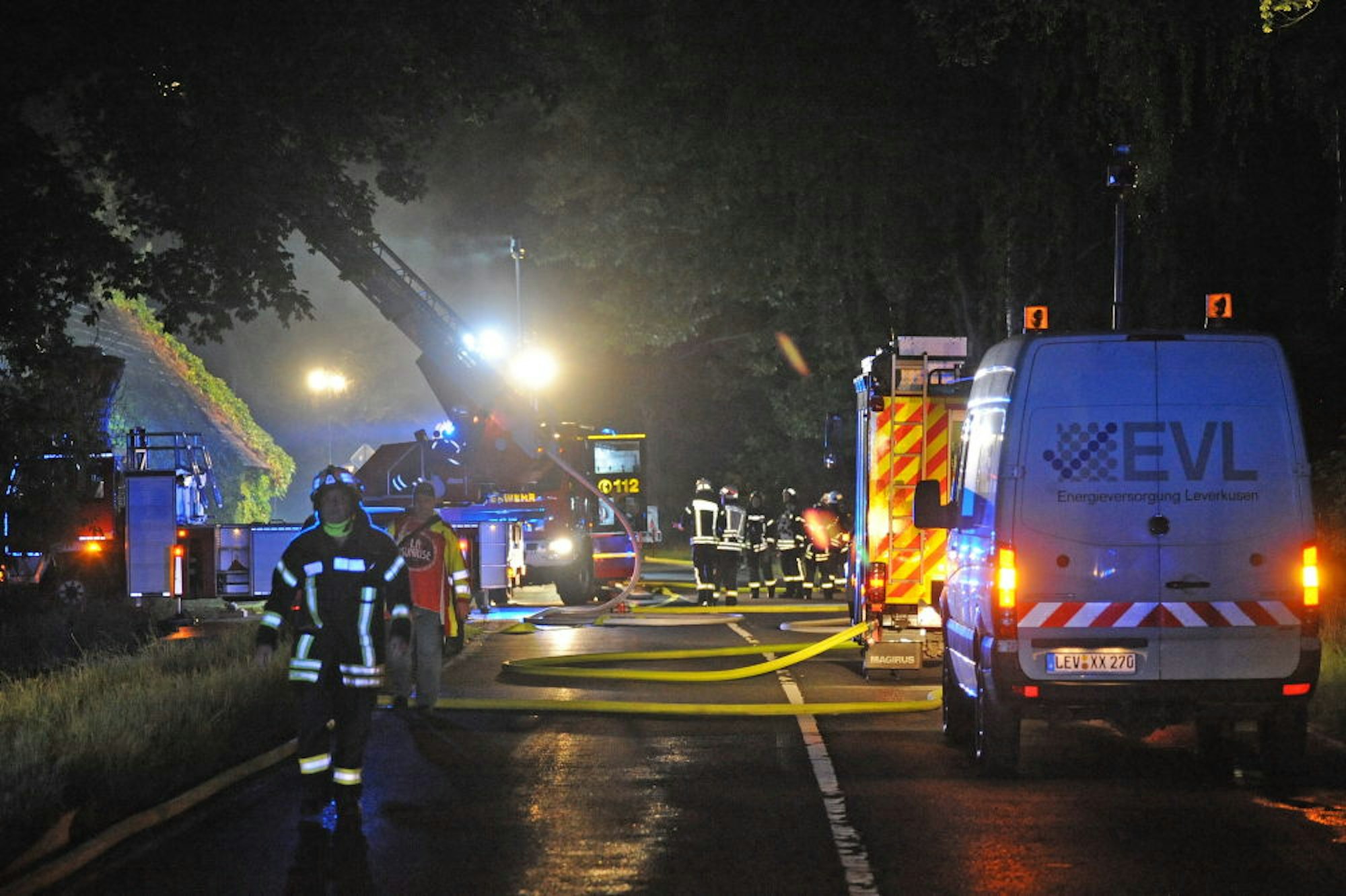 „Das Haus ist unbewohnbar, wie lange es dauert, es wieder herzustellen, weiß ich nicht“, erklärte Thomas Schmitz, Pressesprecher der Leichlinger Feuerwehr. Die war gegen 21.50 Uhr zum Brand gerufen worden. Der Dachstuhl des Gebäudes war in Flammen geraten und brannte in vollem Ausmaß. Zur Unterstützung bei den Löscharbeiten forderte die Leichlinger Wehr Kräfte aus Burscheid, Odenthal und Leverkusen an.