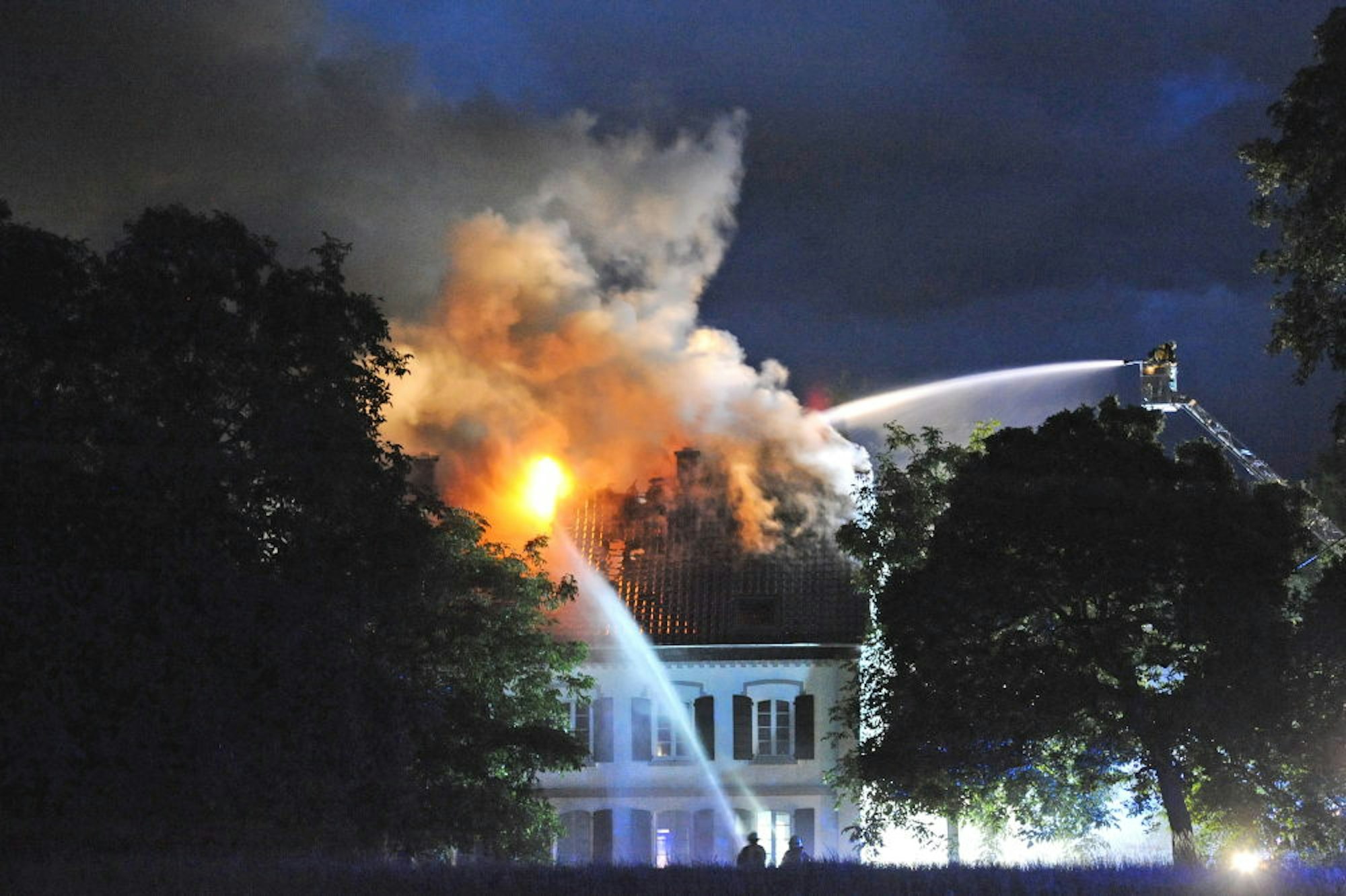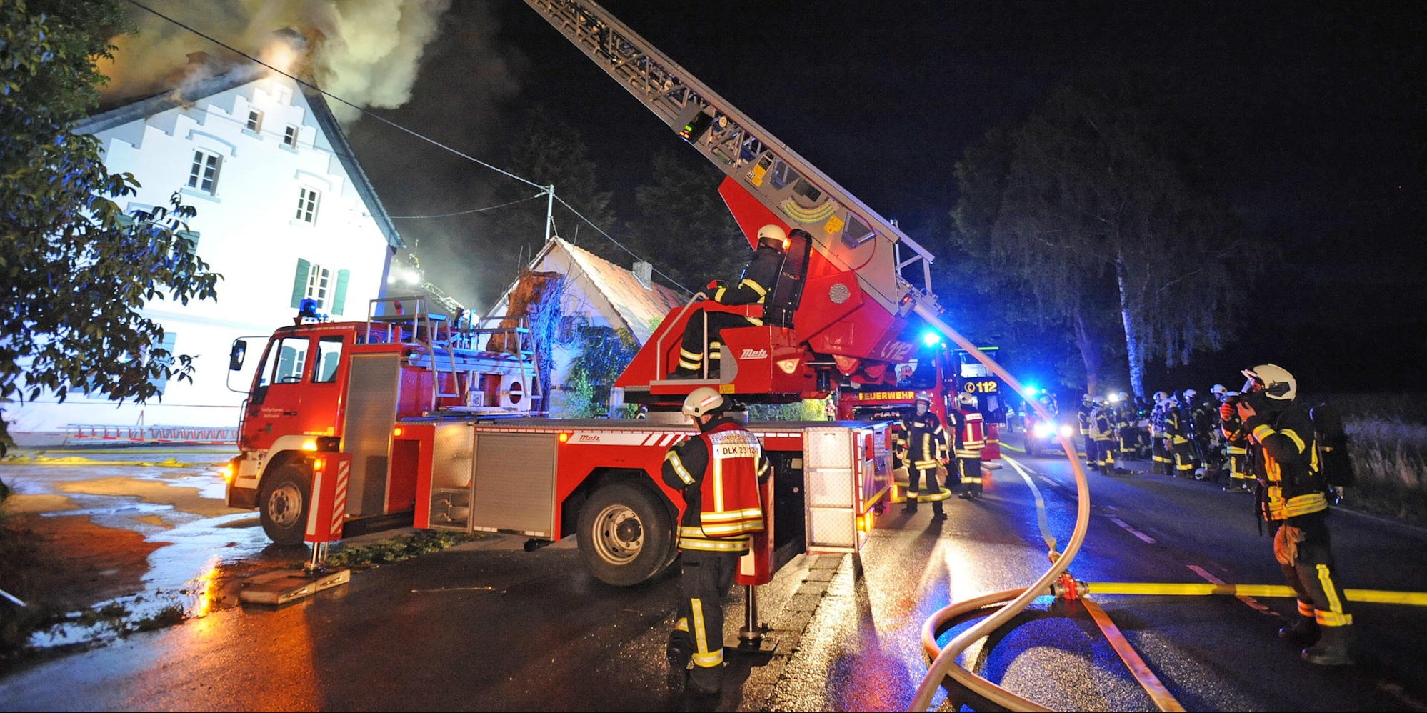 Bis in die Morgenstunden war die Feuerwehr im Einsatz und löschte den Dachstuhl auch von der Drehleiter aus.
