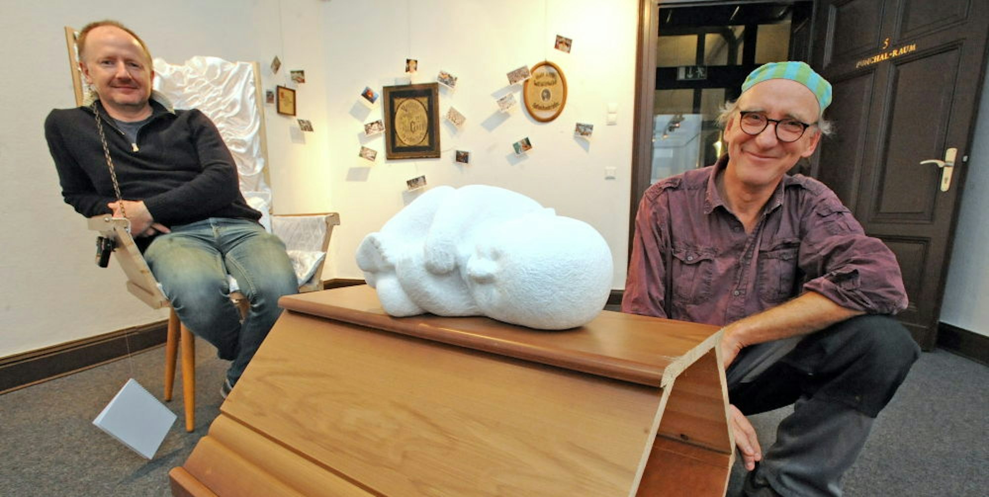 Frank Tschentscher sitzt in einem zum Sessel umgebauten Teil eines Sarges, Berthold Welter kniet daneben.