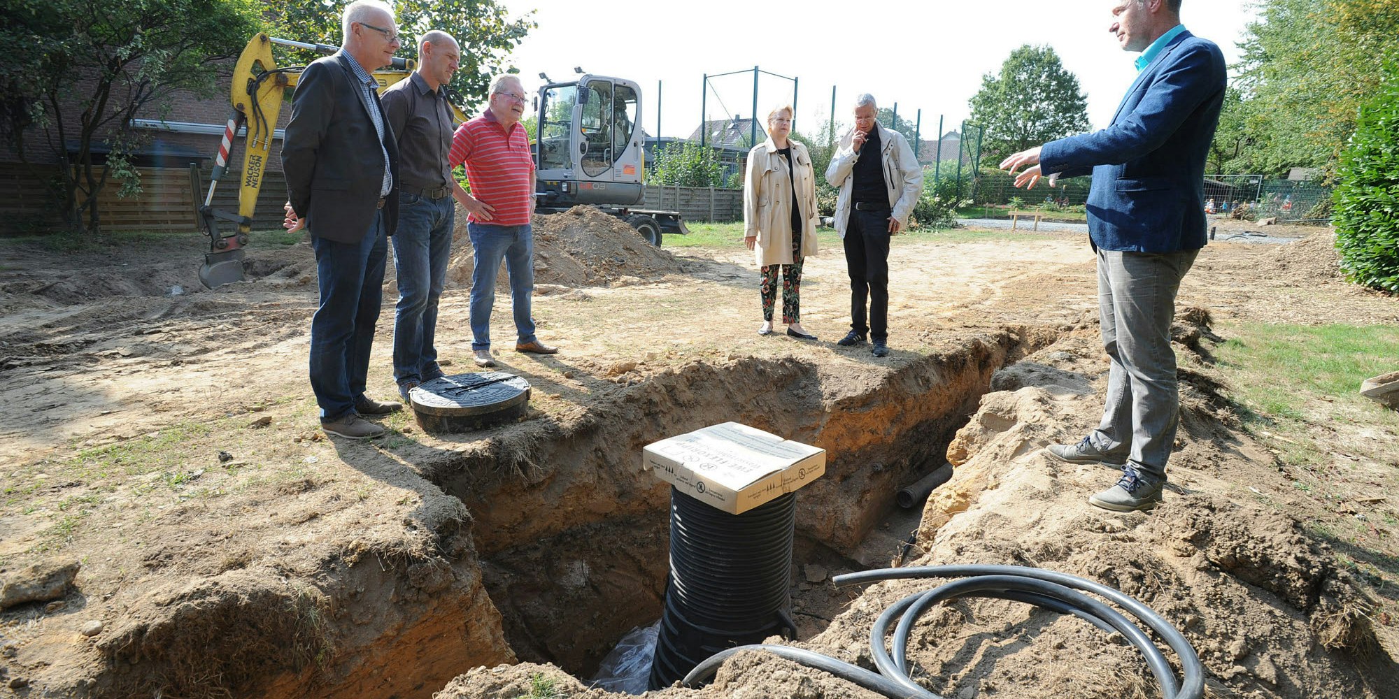 Wolfgang Kalski, Stephan Dammasch, Peter Berger, Andrea Murauer, Helfferich Preuschen und Stephan Bergmann (von links) begutachten die Baustelle an der Kita an der Brückenstraße.