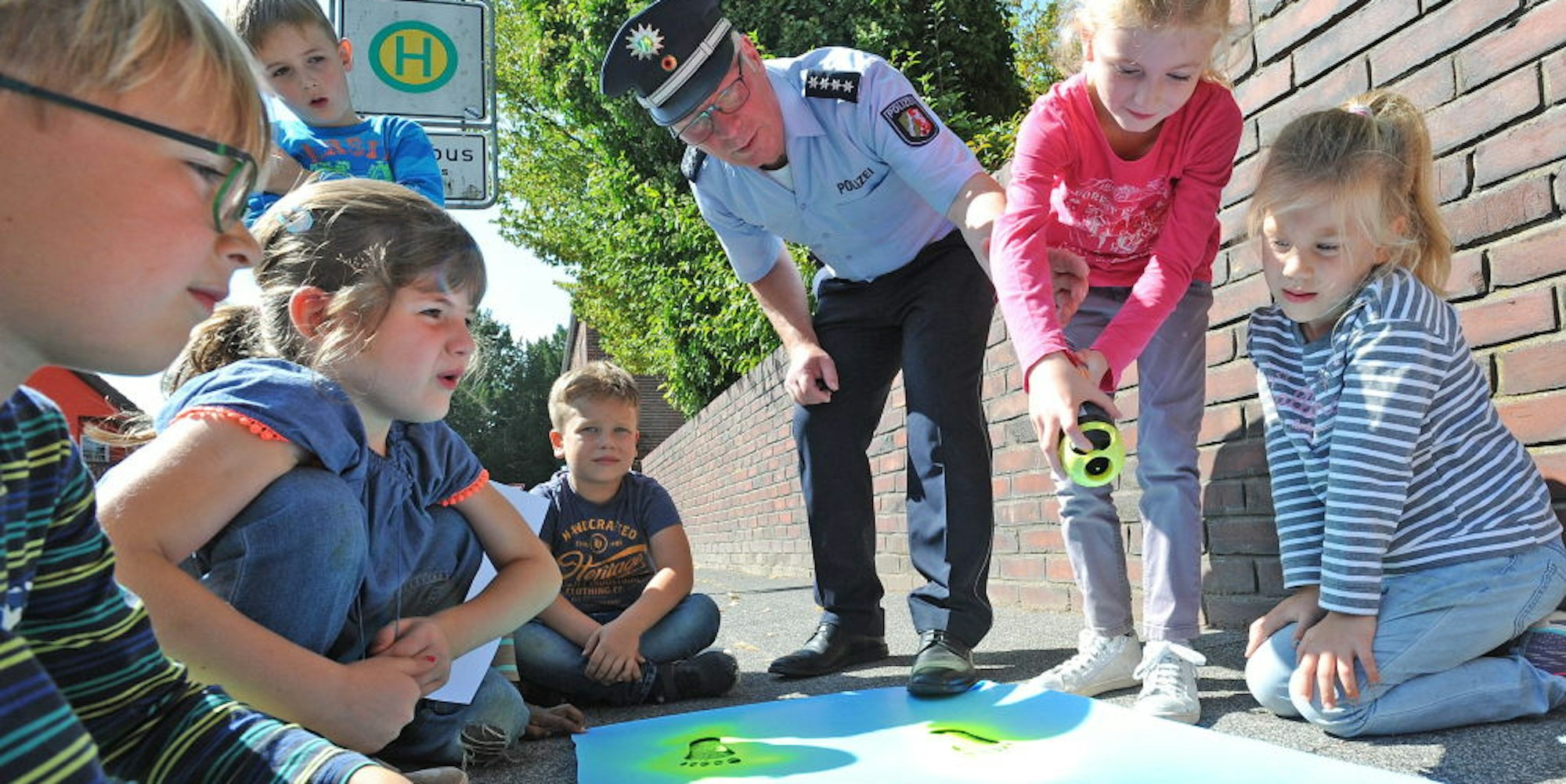 Hauptkommissar Ulrich Schramm zeigte den Kindern, wie die Markierungen mit Schablone und Sprühdose gelingen.
