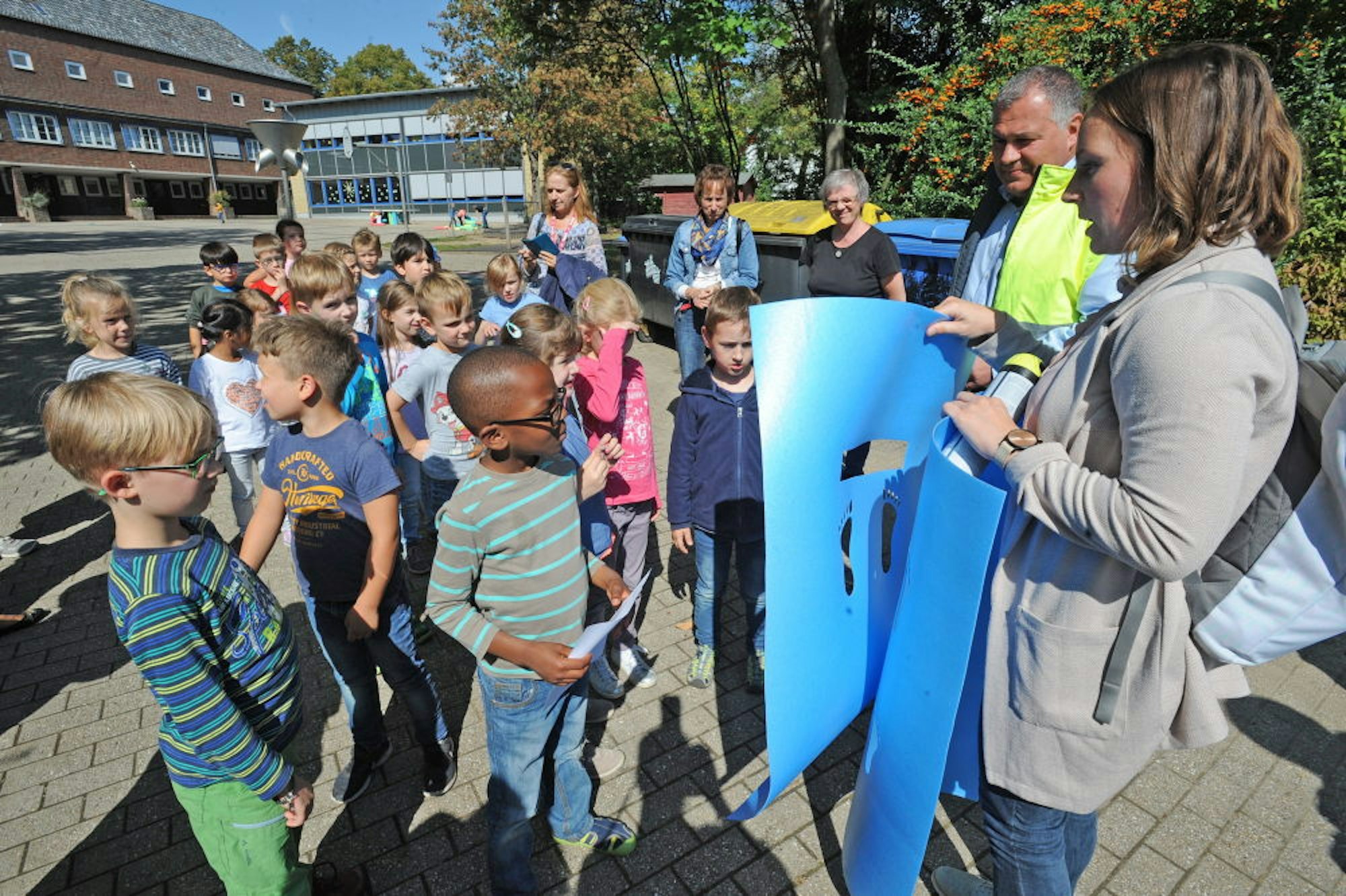 Vom Schulhof aus zogen die Jungen und Mädchen aus der 1a und 1b in zwei Trupps los, um ihren Schulweg in Richtung Bahnhof und Peschecke zu markieren. Die plakatgroßen Kunststoff-Schablonen dazu hatte Anja Richter von der Straßenverkehrsbehörde der Stadtverwaltung in Handarbeit ausgeschnitten, wie ihre Kollegin Justen berichtete. „Füße, die gehen“ und „Füße, die stehen“ erklärte sie den Kindern die beiden vorbereiteten Symbole.