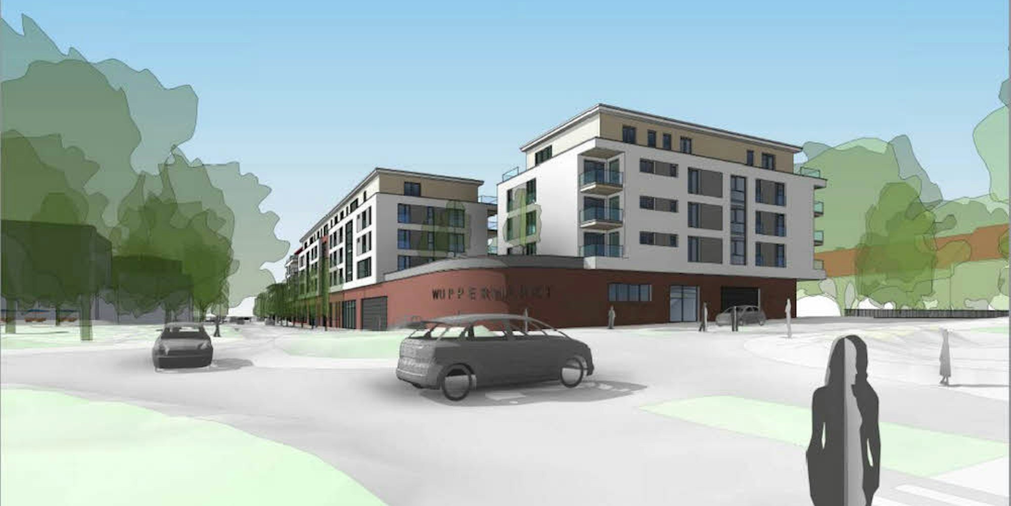 Der künftige Kreisverkehr hat für die Investoren aber auch einen Nachteil: Für das bisher an dieser Stelle vorgesehene Wohngebäude an der Straßenfront mit Unterführung zur Kunden-Tiefgarage ist dort nicht mehr genug Platz. Dieser Bauteil schrumpft um die Hälfte und soll – vermutlich mit Gewerbe-Lokalen im Erdgeschoss – nur noch auf dem nördlichen Teil des heutigen Parkplatzes stehen. Die Bewohner der in zweiter Reihe befindlichen Siedlungshäuser am Wupperweg werden es begrüßen, hatten sie doch befürchtet, in eine Hinterhof-Lage zu geraten.