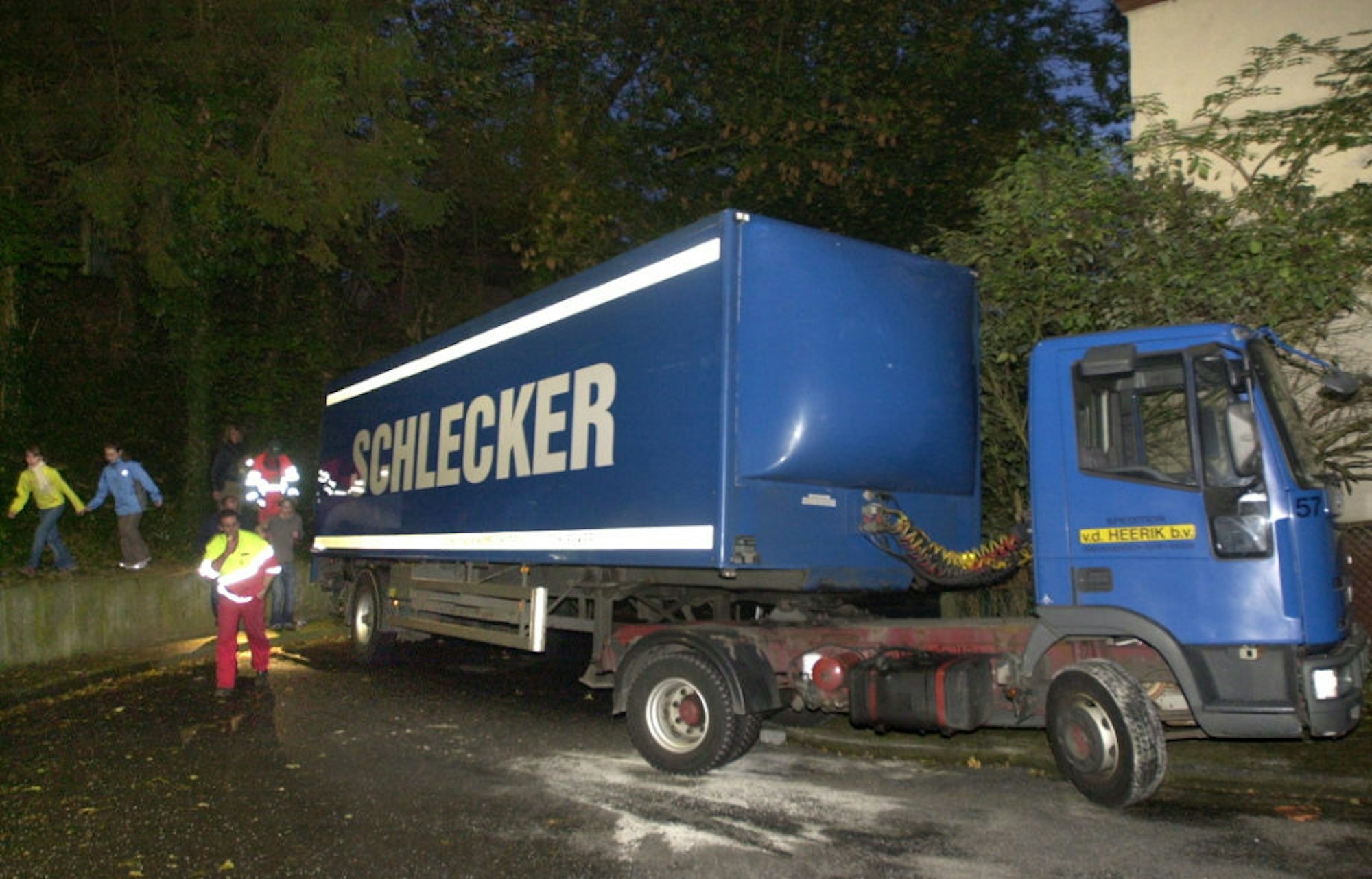 Hoffnungslos festgefahren haben sich 2006 zwei verirrte Lkw in der steilen Kurve am Bechlenberg. Ein Bergungs-Lkw befreite sie.
