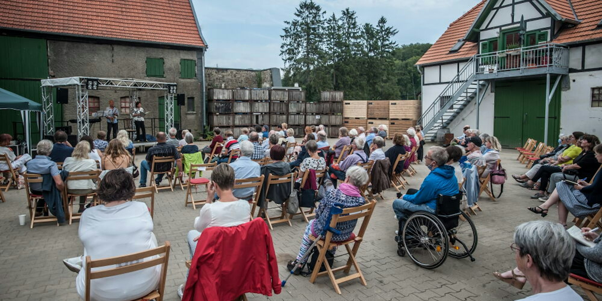 Als Veranstaltungsort etabliert werden für die neue städtische Reihe „Kultur auf dem Hof“ die Bauernhöfe auf dem Leichlinger Land. „Das sind zirka 20 ganz besondere Orte, die wir mit ziemlichem Aufwand hergerichtet haben“, erzählt Ute Gerhards, Leiterin des Büro Bürgermeister. In kleinen, geschlossenen Räumen – wie bei „Kultur im Schloss“ auf dem Eicherhof – wird erst mal lange Zeit nichts stattfinden können. Nun sitzt man in Grüppchen auf dem aufgeräumten und gefegten Innenhof des Gut Nesselrath. Es ist idyllisch zwischen den leicht gewellten roten Schindeldächern, den grünen Türen und Fensterläden. Vor dem alten Burgtorbogen schnattern die Gänse, und man wartet nur darauf, dass vielleicht eine Katze um die Klappstühle schleicht.