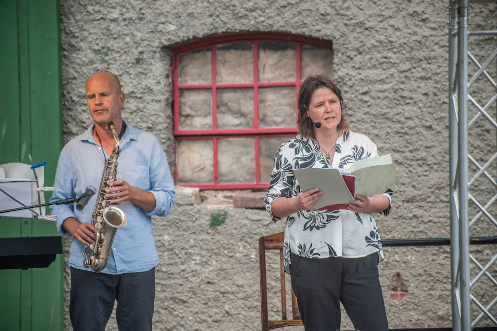 Mit „Schweigen – eine Fabel“ beginnt die musikalische Lesung. Die Künstler kommen langsam von hinten geschlichen, Gebauer spielt das Saxofon und lässt sein Instrument die Einleitung erzählen. Mit fast geschlossenen Augen und sanfter Melodie findet er seinen Weg über den Hof. „In diesen ungewöhnlichen Zeiten“, sagt de Boer auf dem kleinen Bühnenaufbau, kommen wir zusammen. Die Angst stamme bei Poe aus der Seele, aus dem Innersten. Vielleicht auch ein Mutzuspruch, sich nicht von Äußerem verunsichern zu lassen.