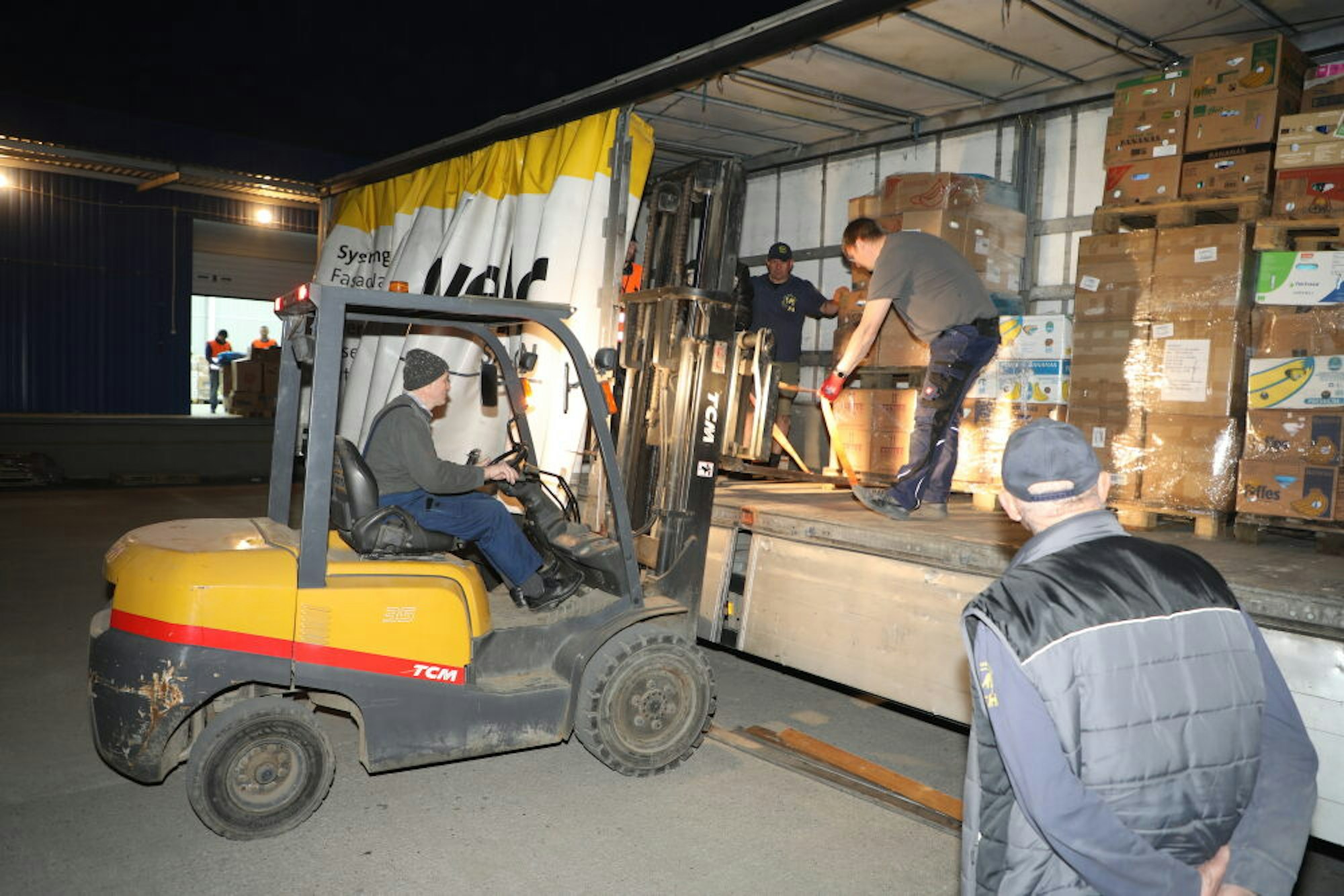 Knapp drei Tage nach dem Start in Overath werden die 20 Tonnen Lebensmittel an der ukrainischen Grenze ausgeladen . . .
