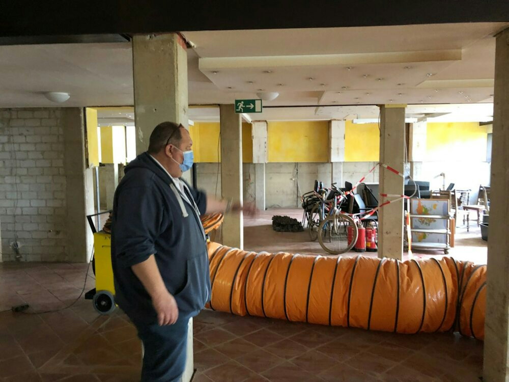 Hausmeister Holger Hoffmann in den entkernten Räumen des früheren Wahlbüros, wo Bautrockner und Lüfter laufen.