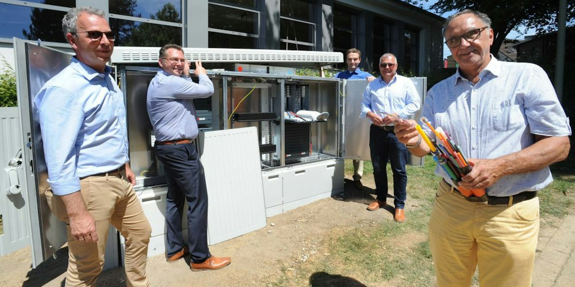 Es ist nur ein unscheinbarer grauer Kasten. Aber er wurde als Meilenstein des Projektes gefeiert, das in Witzhelden nun kurz vor der Vollendung steht und bis 2022 ganz Leichlingen ein Glasfasernetz beschert. Eine Investition von 30 bis 35 Millionen Euro.