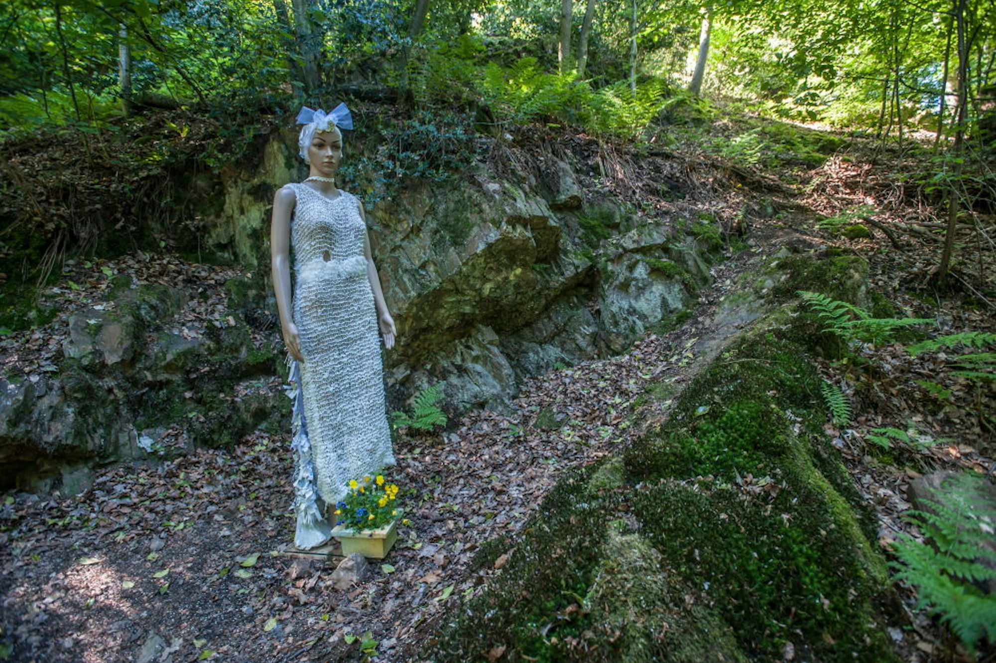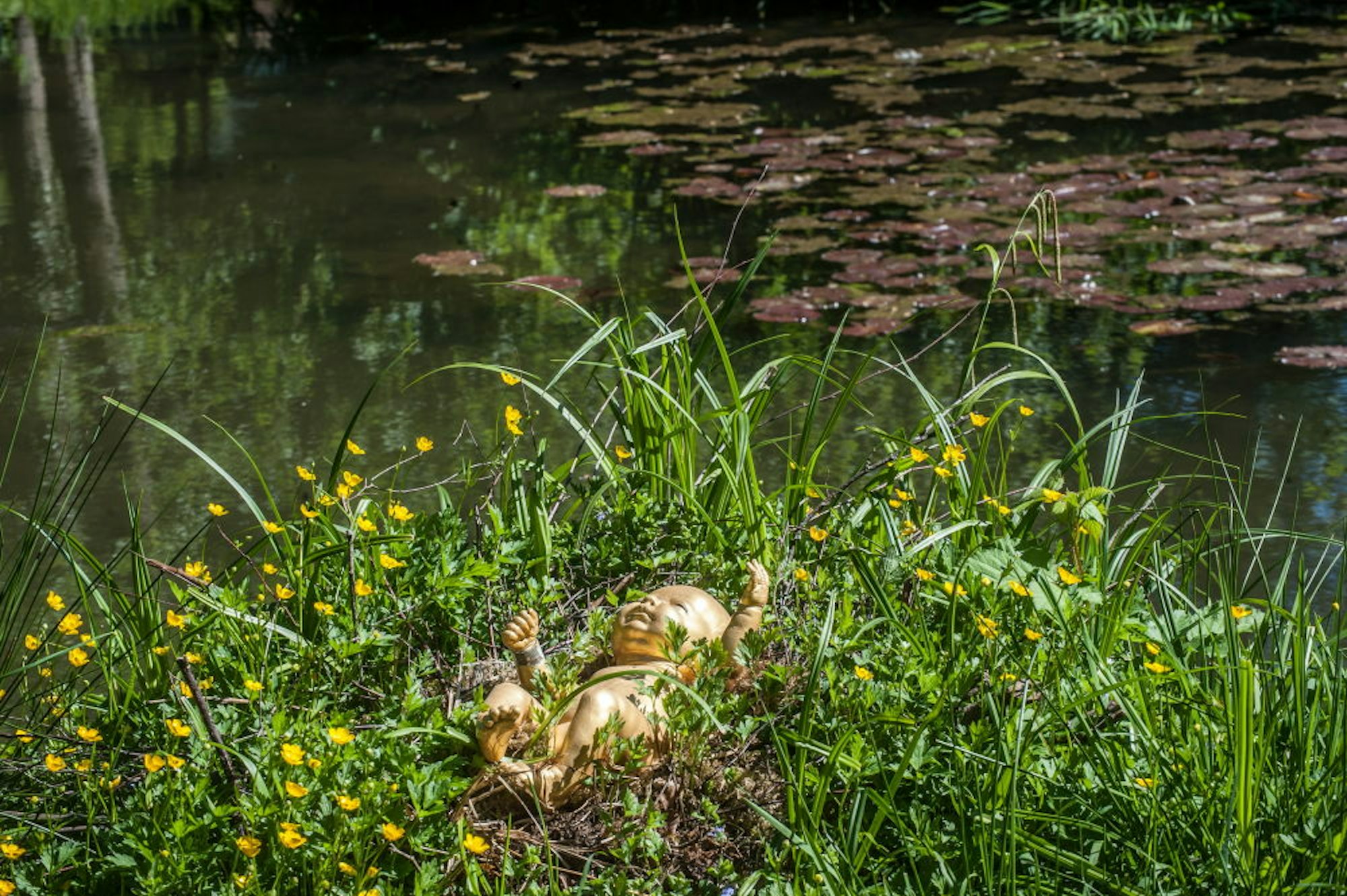 Man kann an einem Glücksrad drehen und Münzen in einen Brunnen werfen. Für manche war kürzlich noch gehamstertes Toilettenpapier das höchste Gut (Manfred Boelke hat voller Sarkasmus eine ganze Palette davon in die Gegend gestellt). Für viele ist die Geburt eines Kindes das höchste Glück: Eine goldene Babypuppe hat Regine Evertz wie einen Schatz auf einer Insel im Teich gebettet. Mutter- und Kind-Szenen gibt es mehrere auf dem Gelände, auch einen in Y-Tong gehauenen Embryo. Für andere ist die Hochzeit der schönste Tag im Leben: Die lebensgroße Braut von Mechthild Hartmann-Schäfers, die von hoch oben durch die Bäume strahlt, entpuppt sich allerdings als schöner Schein: Ihr weißes Kleid ist aus Mülltüten und Textiletiketten gestrickt.