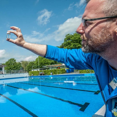 Helge Schönzeler, hier bei einer Wasserprobe am Becken, ist neuer Betriebsleiter des Leichlinger Schwimmbades.
