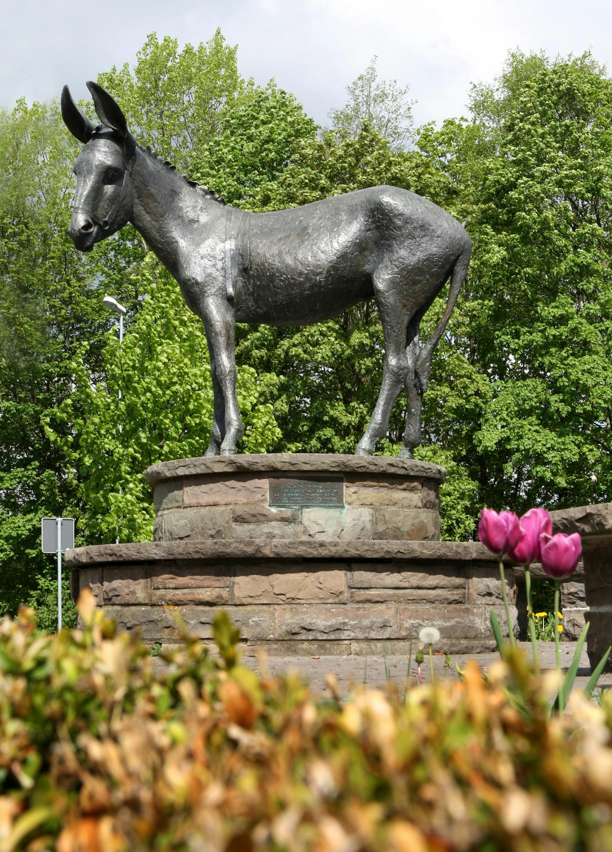 Von der Bushaltestelle gehen wir einige Meter zurück zum Kreisverkehr, an dem das Wahrzeichen des Ortes steht: der Bechener Esel (F). Der war früher das Lasttier Nummer eine, wenn die Bauern des Höhenortes ihre Waren auf die Märkte der Umgebung brachten. Vom Esel aus folgen wir der gelben Wegemarkierung des Bergischen Panoramasteigs einige Meter die Kölner Straße entlang und biegen dann hinter der Gaststätte Kalyva links ab.