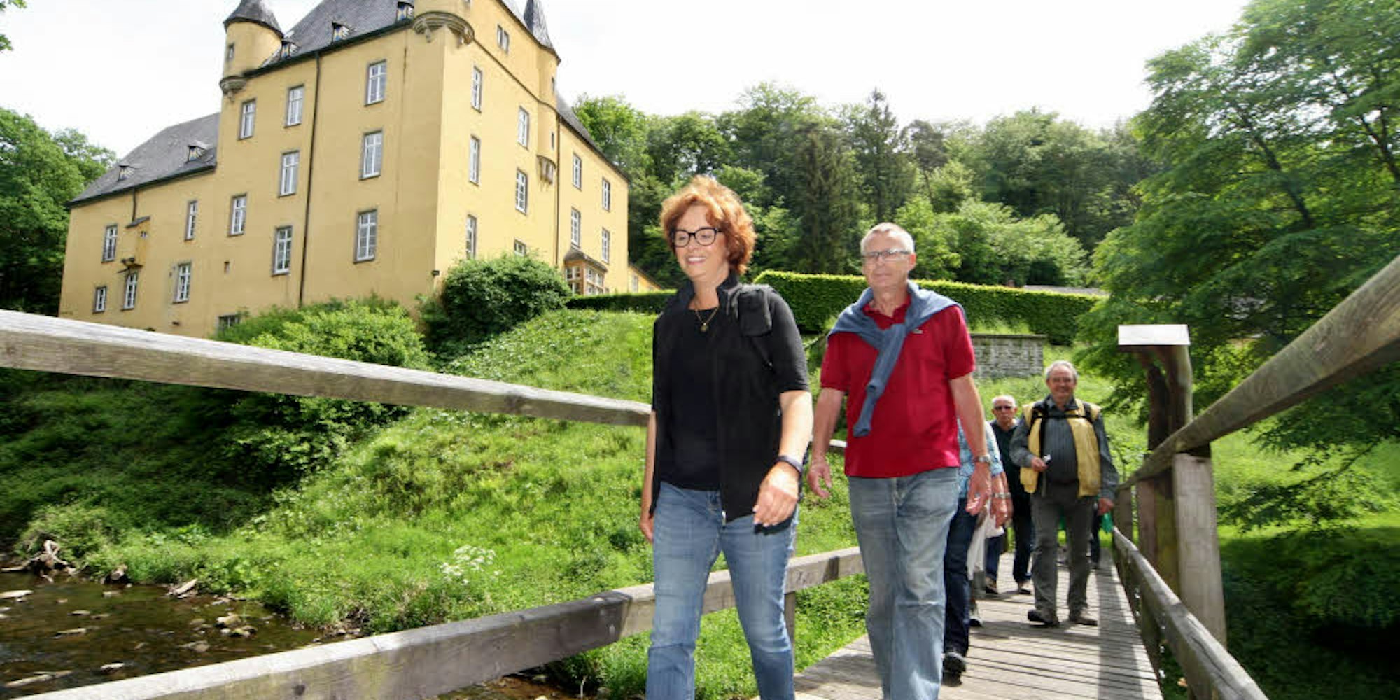 Schloss Strauweiler sei nach Burg Eltz die am meisten gezeichnete Anlage der Spätromantik, sagt der Prinz nicht ohne Stolz. „Verändern Sie nur die Farbe nie, das macht immer so eine Freude, wenn man das Schloss drüben von der Straße aus sieht“, wünscht sich Helma Heider aus Bensberg noch vom Schlossherrn, bevor dieser die Gruppe auf dem privaten Steg über die Dhünn weiter Richtung Altenberg wandern lässt. Herbert Berghaus aus Schildgen verabschiedet sich besonders herzlich, er wohnte als Kind in Odenthal und ist mit Hubertus Prinz zu Sayn-Wittgenstein zur Schule gegangen.
