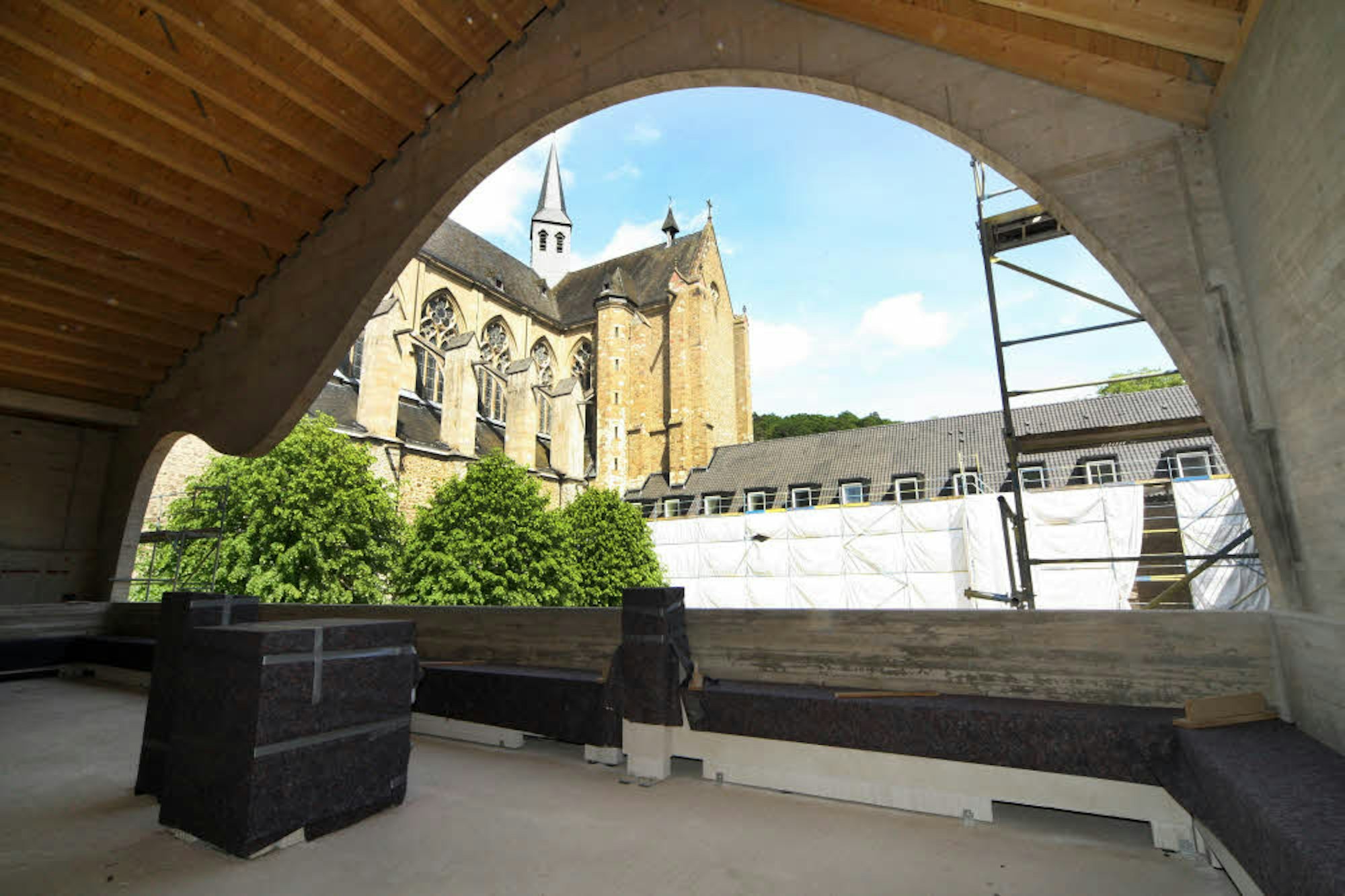 Alte Mauern und neue Betonelemente kontrastieren bewusst in den beiden Innenhöfen, die hinter dem wieder an die ursprüngliche Stelle verlegten Haupteingang entstanden sind. Um Gästen und Besuchern künftig eine Orientierung zu geben, haben die Planer auf alte klösterliche Strukturen zurückgegriffen. Eine Art Kreuzgang umgibt den Empfangshof, der durch geöffnete Torbögen einen Blick in den künftigen Dom-Laden ermöglicht.