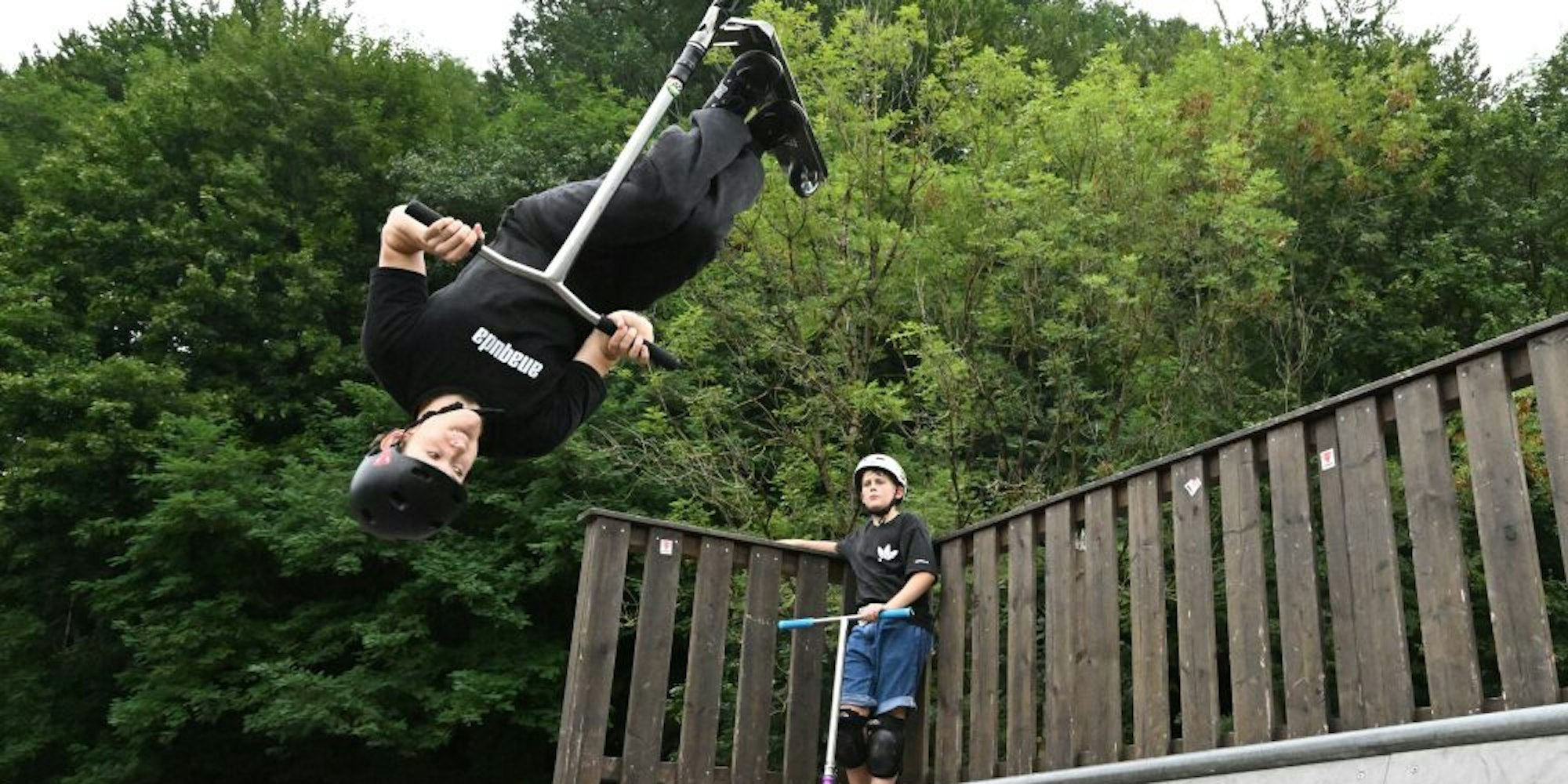 Auch im Skate-Park ging es heiß her. Am Nachmittag übten die Kinder und Jugendlichen, was sie am Morgen in den Workshops gelernt hatten. Lennox, Felix und Finn feuerten sich gegenseitig bei ihren Tricks in der Halfpipe an. „Allez hopp“ und der Scooter wird in der Luft herumgewirbelt. Lennox überzeugt mit einem double Tailwhip: die Standfläche des Scooters dreht sich im Sprung zweimal um die Lenkachse. Finn legt gekonnt mit einem Kick-Less nach: die Standfläche des Scooters dreht sich ebenfalls, doch wird durch den Schwung des Lenkers noch in der Luft in die andere Richtung zurückgedreht. Voraussetzung, dass ein Trick „geschafft“ ist, ist das man wieder mit den Füßen auf der Standfläche landet. Ansonsten muss er erneut probiert werden.