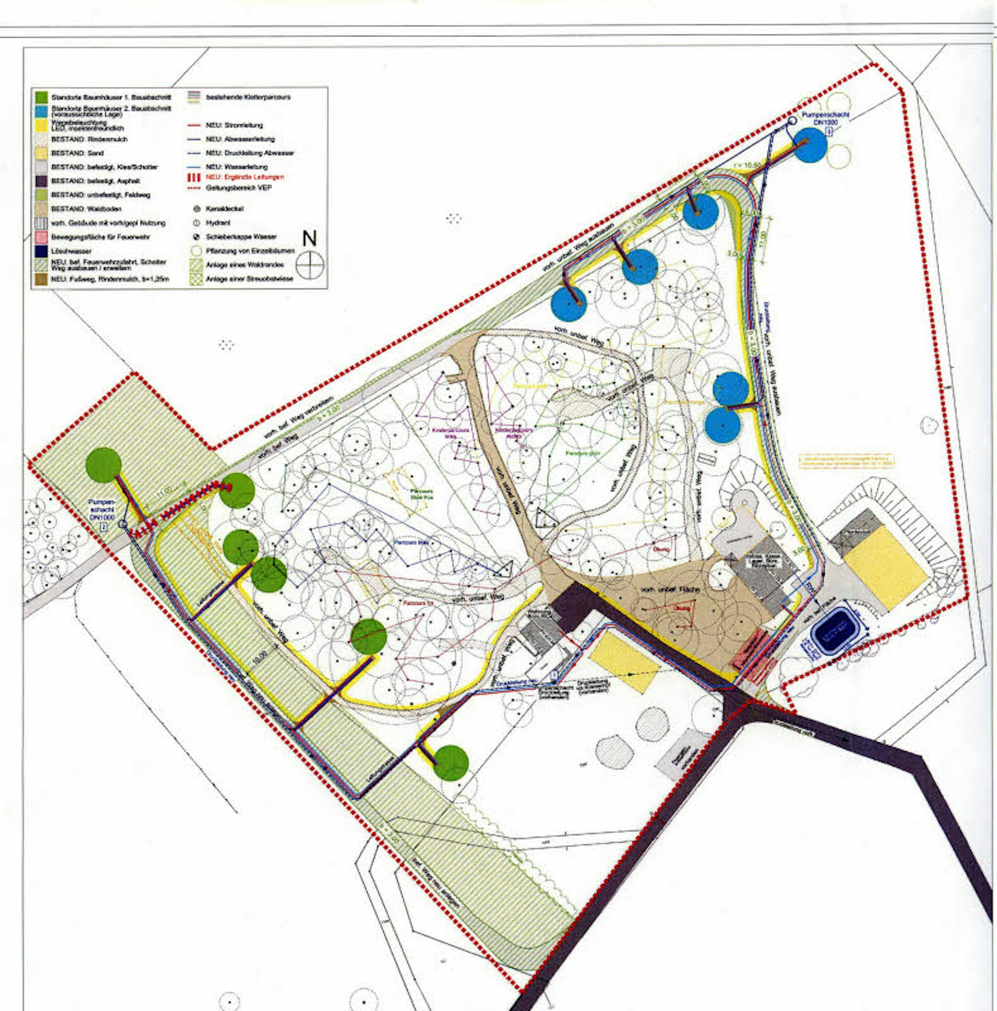 Das Areal mit den Baumhäusern, die zuerst errichtet werden sollen (grüne Punkte), und denen der zweiten Bauphase (blau).