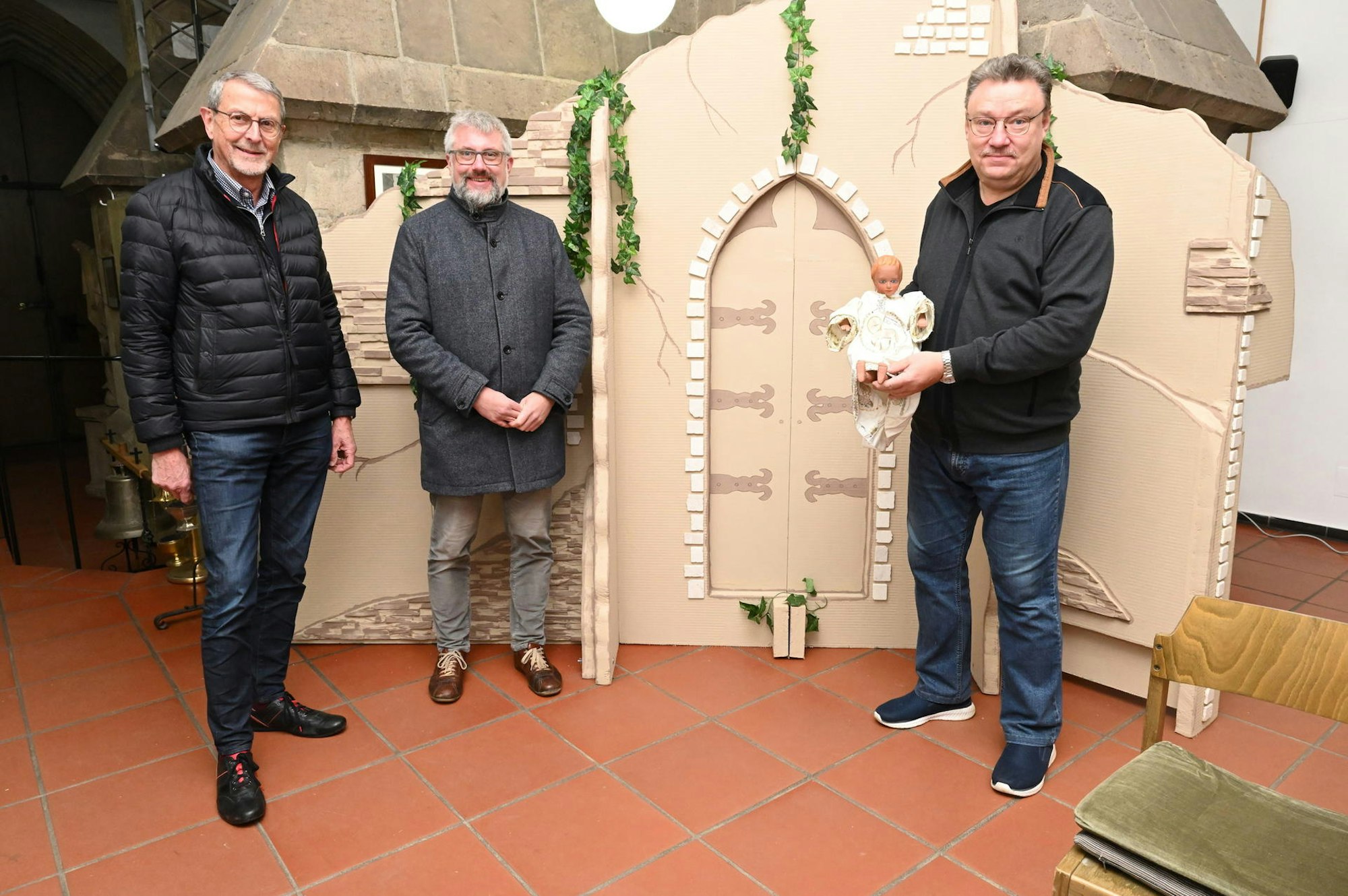 Erstbezug für das Jesuskind: Dr. Norbert Orthen, Pfarrer Thomas Taxacher und Küster Adam Mainusch (v.l.) vor dem Rohbau.