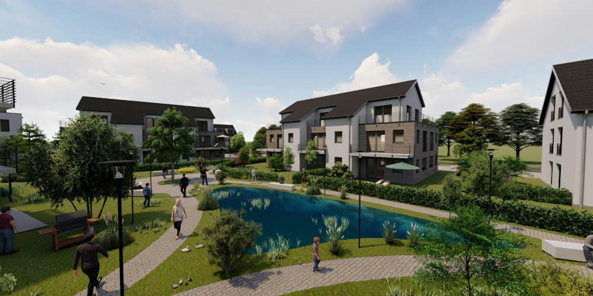 So könnte das Neubaugebiet später einmal aussehen. Auch ein Teich ist vorgesehen.